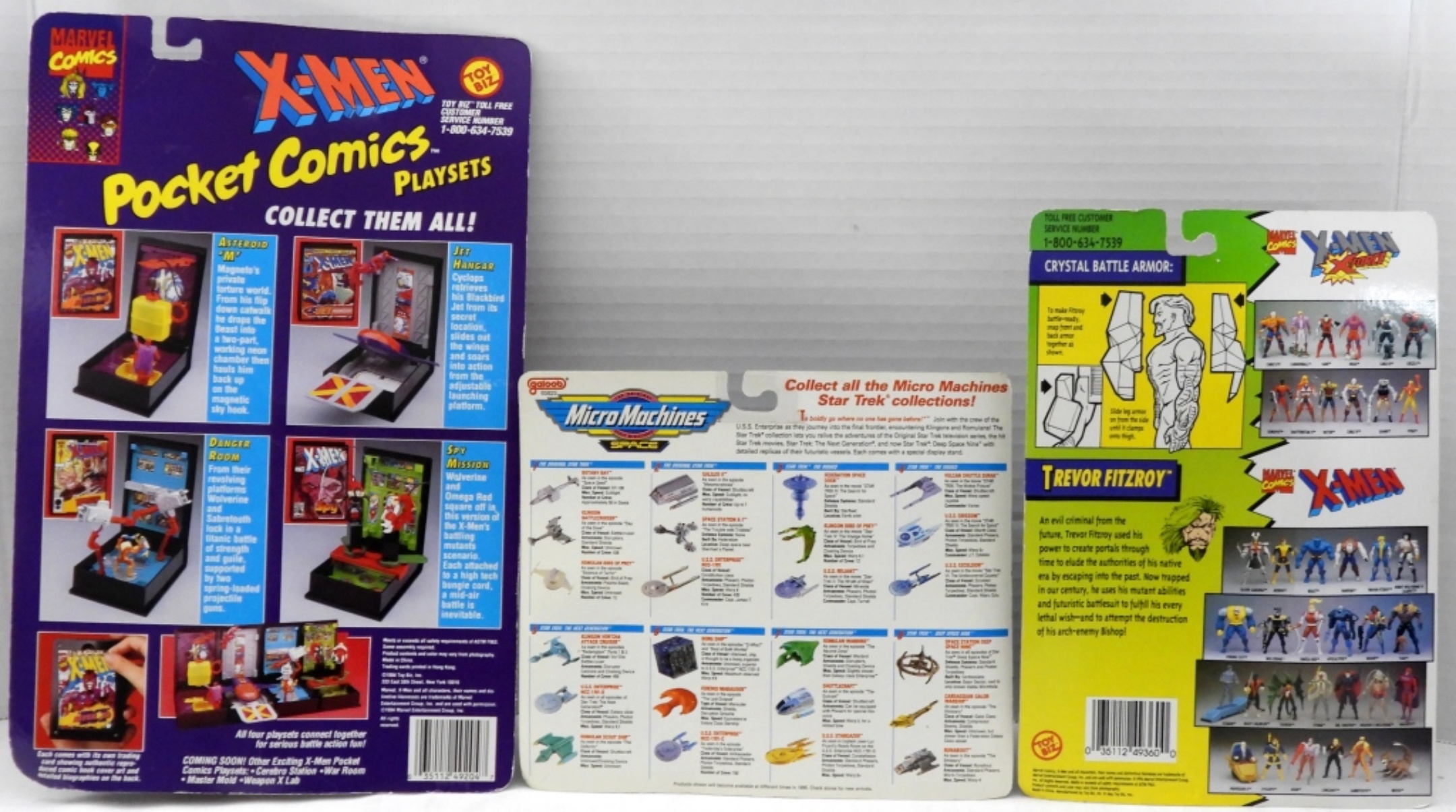 1994 TOYBIZ MARVEL X-MEN TREVOR FITZROY ACTION FIGURE; 1994 TOYBIZ MARVEL X-MEN POCKET COMICS JET HANGAR PLAYSET; 1995 MICROMACHINES STAR TREK SET – ALL ARE FACTORY SEALED IN ORIGINAL BOXES