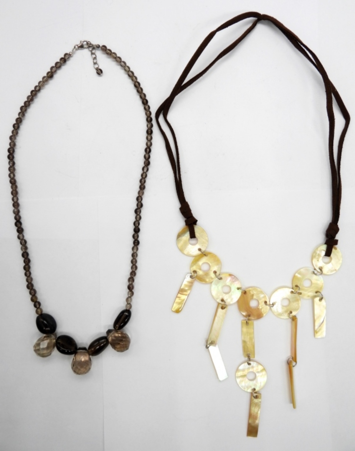 Beautiful Smokey Quartz Faceted Beaded Necklace, 18″. Leather Cord Lariat Necklace with Mother of Pearl Charms, 20″.