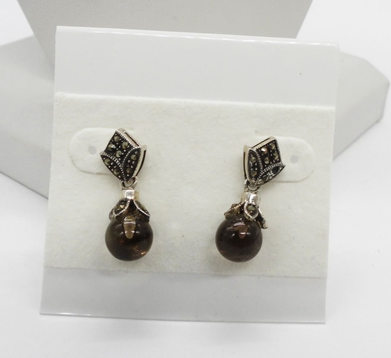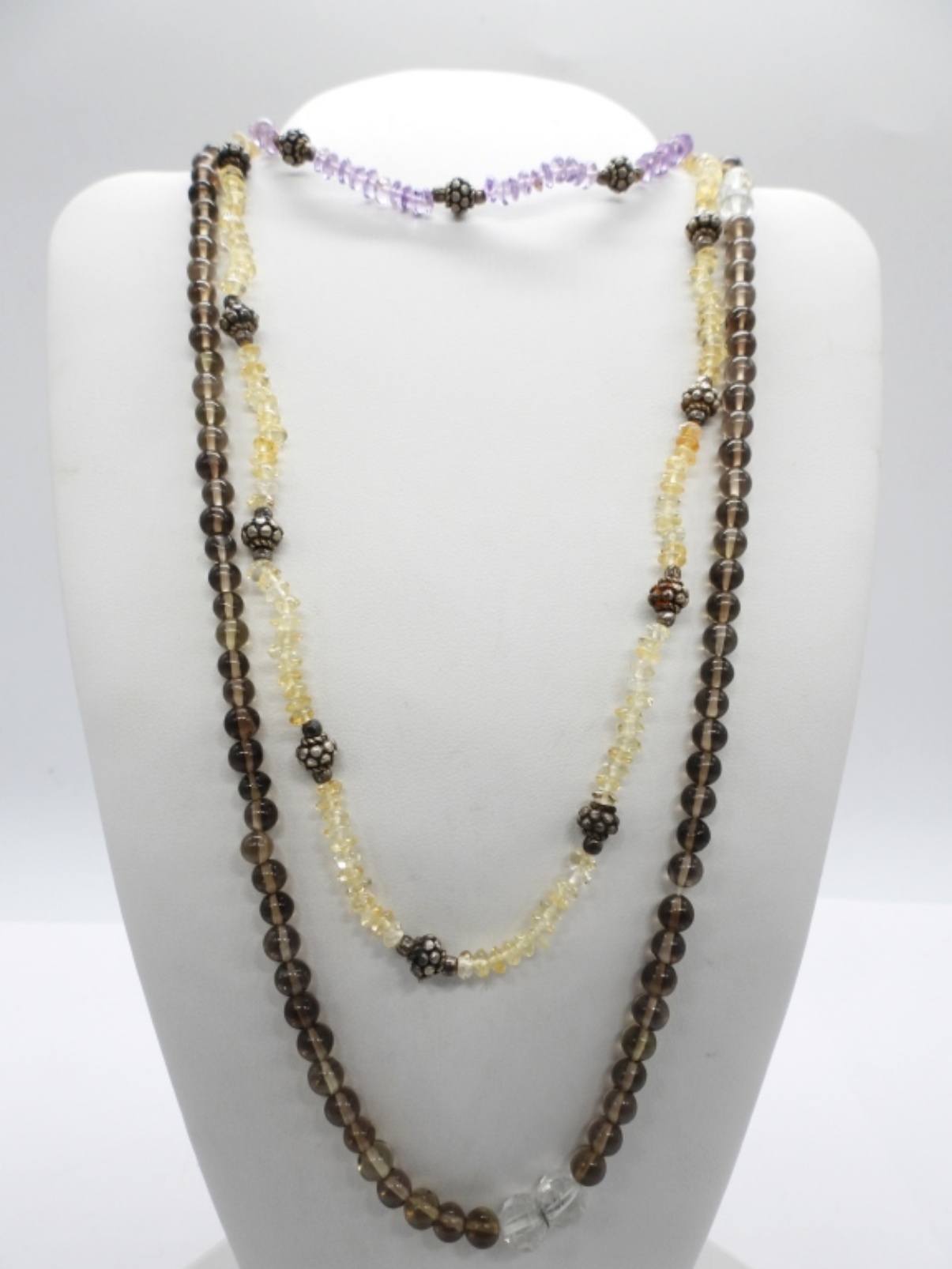 Smokey Quartz Beaded Necklace (18″) with Matching Earrings. Beaded White and Purple Necklace (15″) and Bracelet (6″).