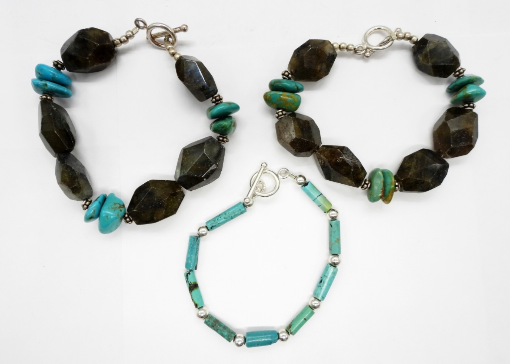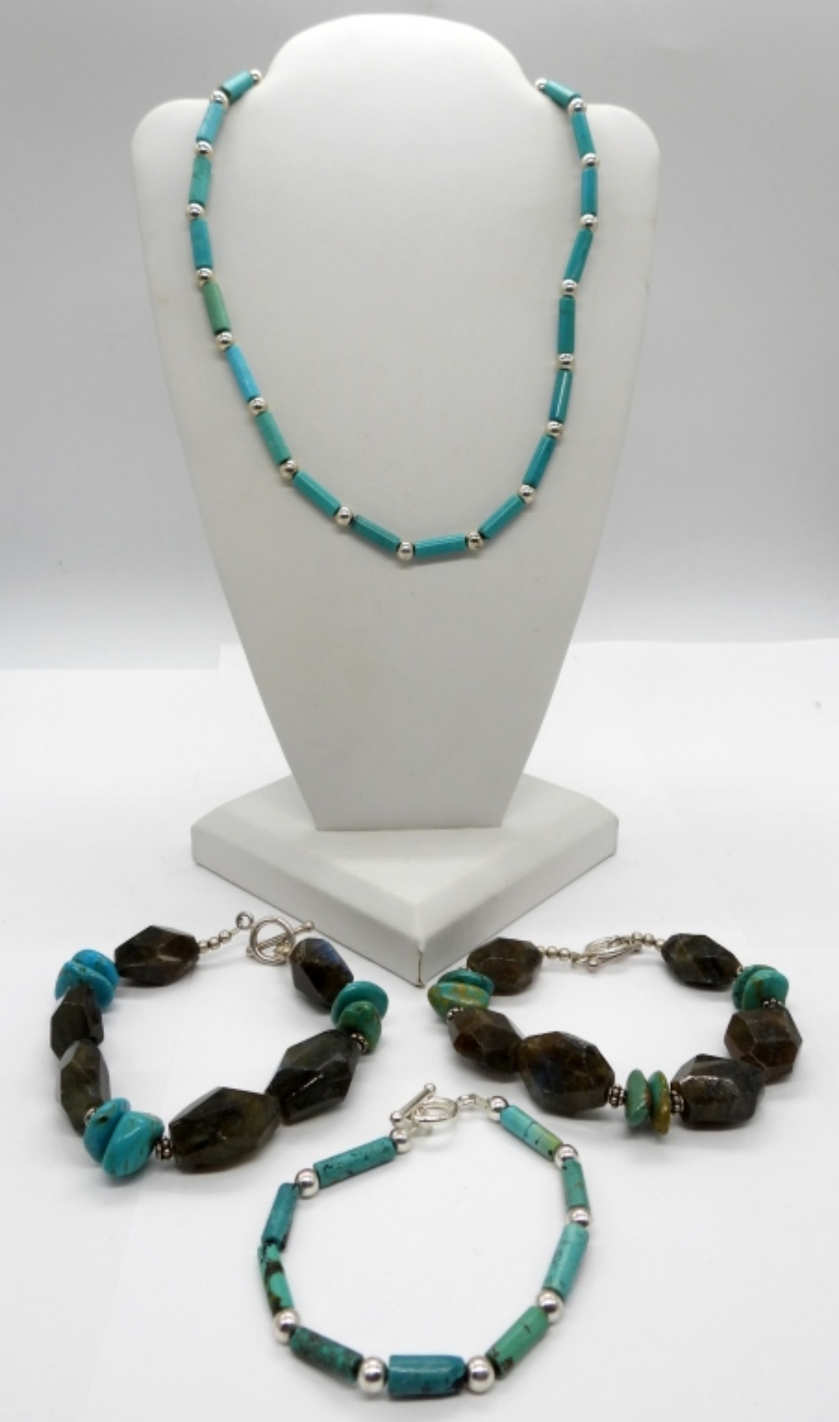 Cylindrical Turquoise Beaded Necklace (15″) and Bracelet (7″) and Two Bracelets (8.5″) with Turquoise and Labradorite Gemstones. Sterling Clasps.