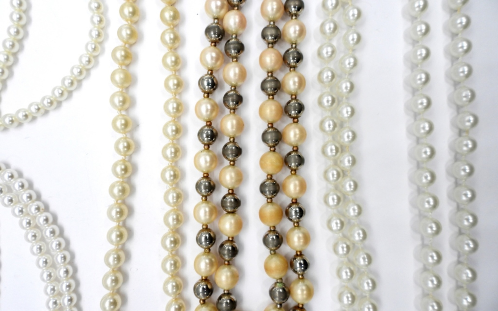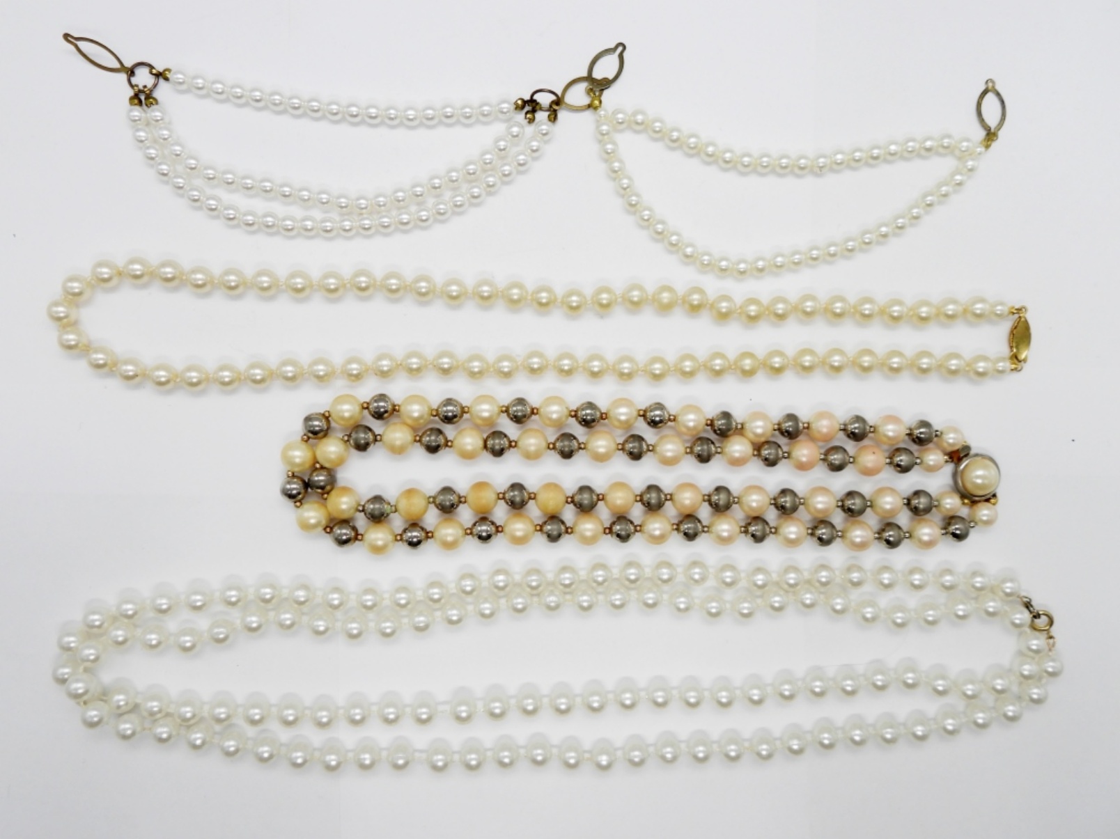 Vintage Pearl Jewelry. Two Vintage Simulated Pearl, Button Down Collar/Sweater Clip. 47″ Faux White Pearl Strand. Vintage strand of Natural Pearls, 23″. Double Strand of Faux Pearl and Silver Tone Beads, 16″.