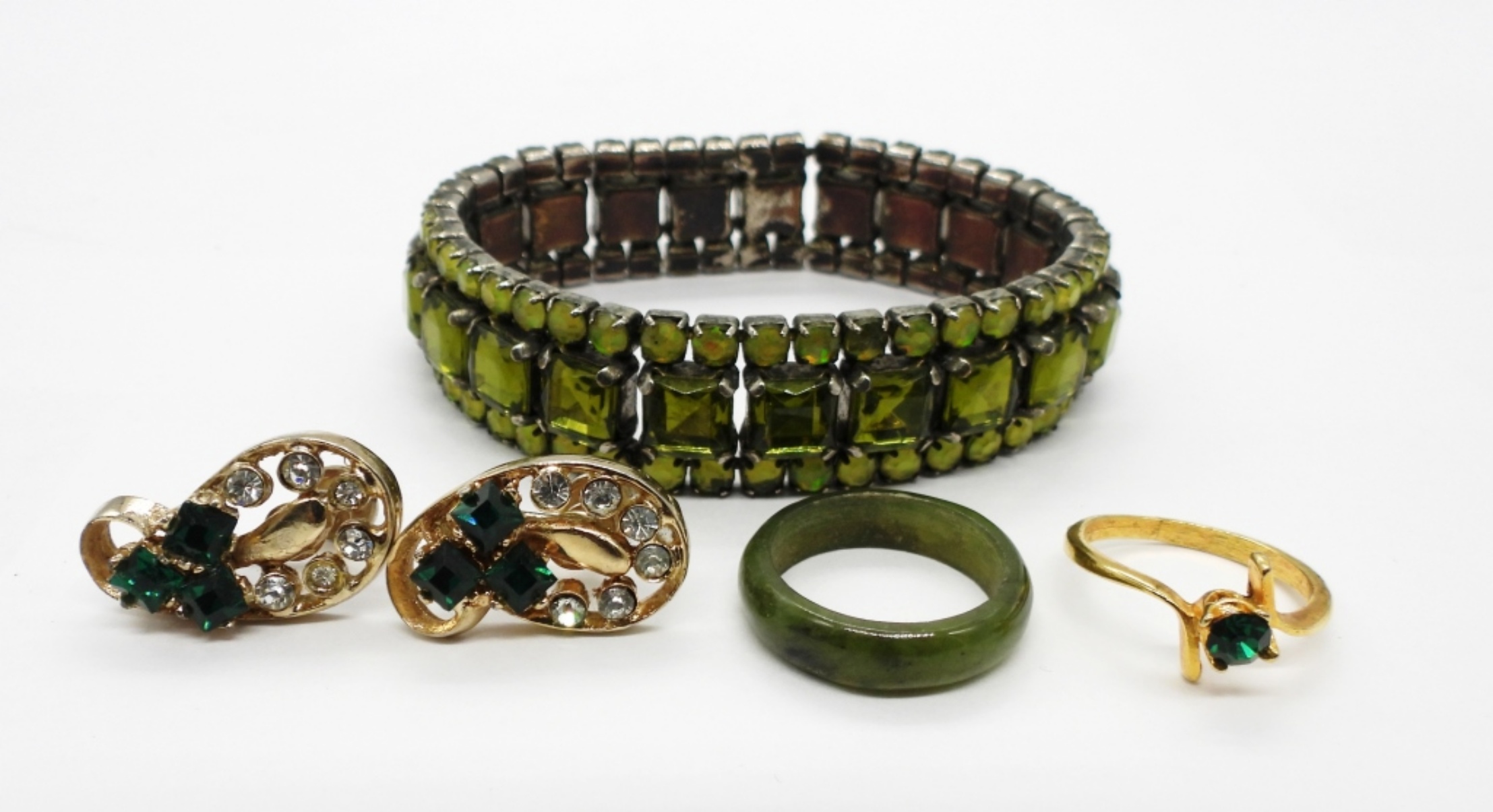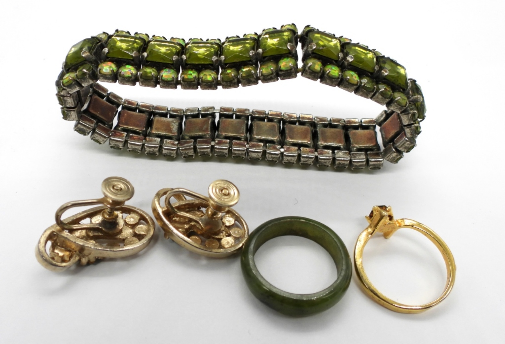 Green Jade Ring, Size 7.5. Gold Tone Ring with Green Rhinestone, Size 7. Vintage Gold Tone Screw Back Earrings with Green and White Rhinestones. Stretchy silver tone bracelet with Green Plastic Gemstones.
