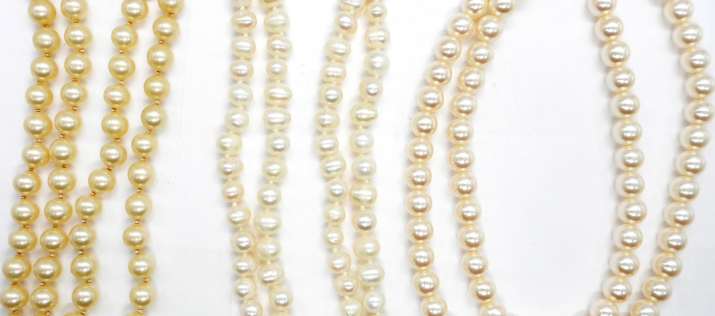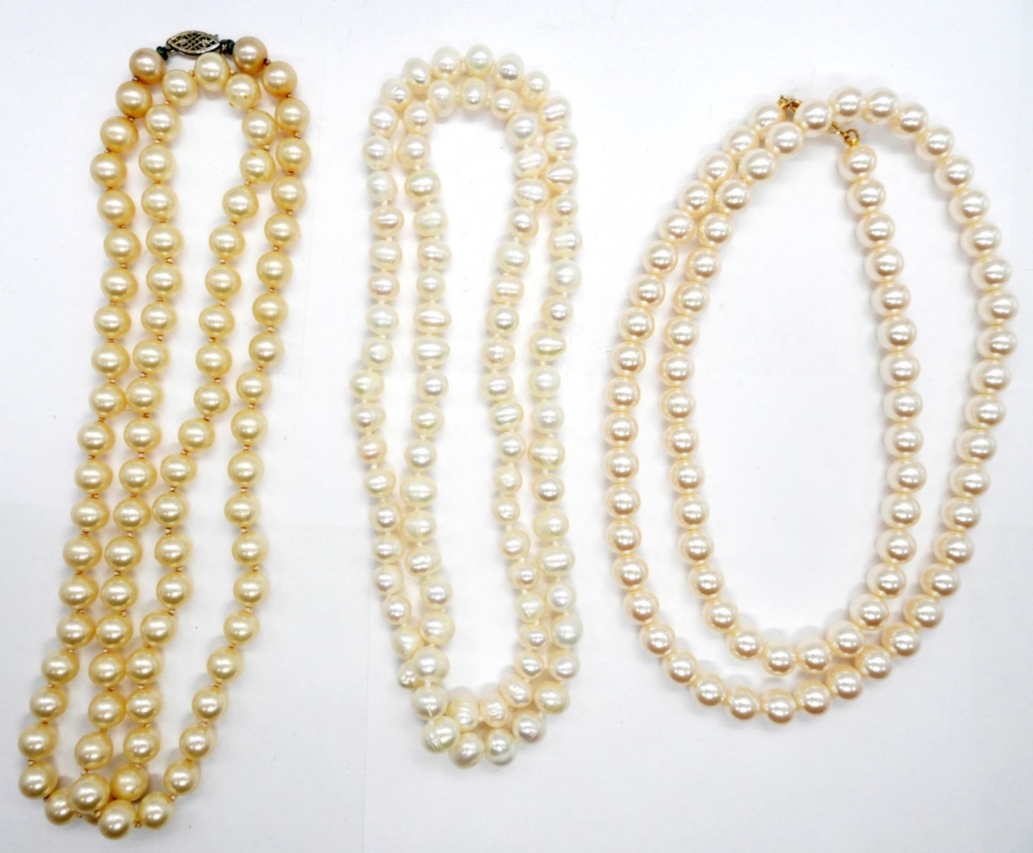 Three Strands of Beautiful Pearls. 22″ Faux Pearls. 26″ Freshwater Pearls. 28″ Vintage Natural Pearls.
