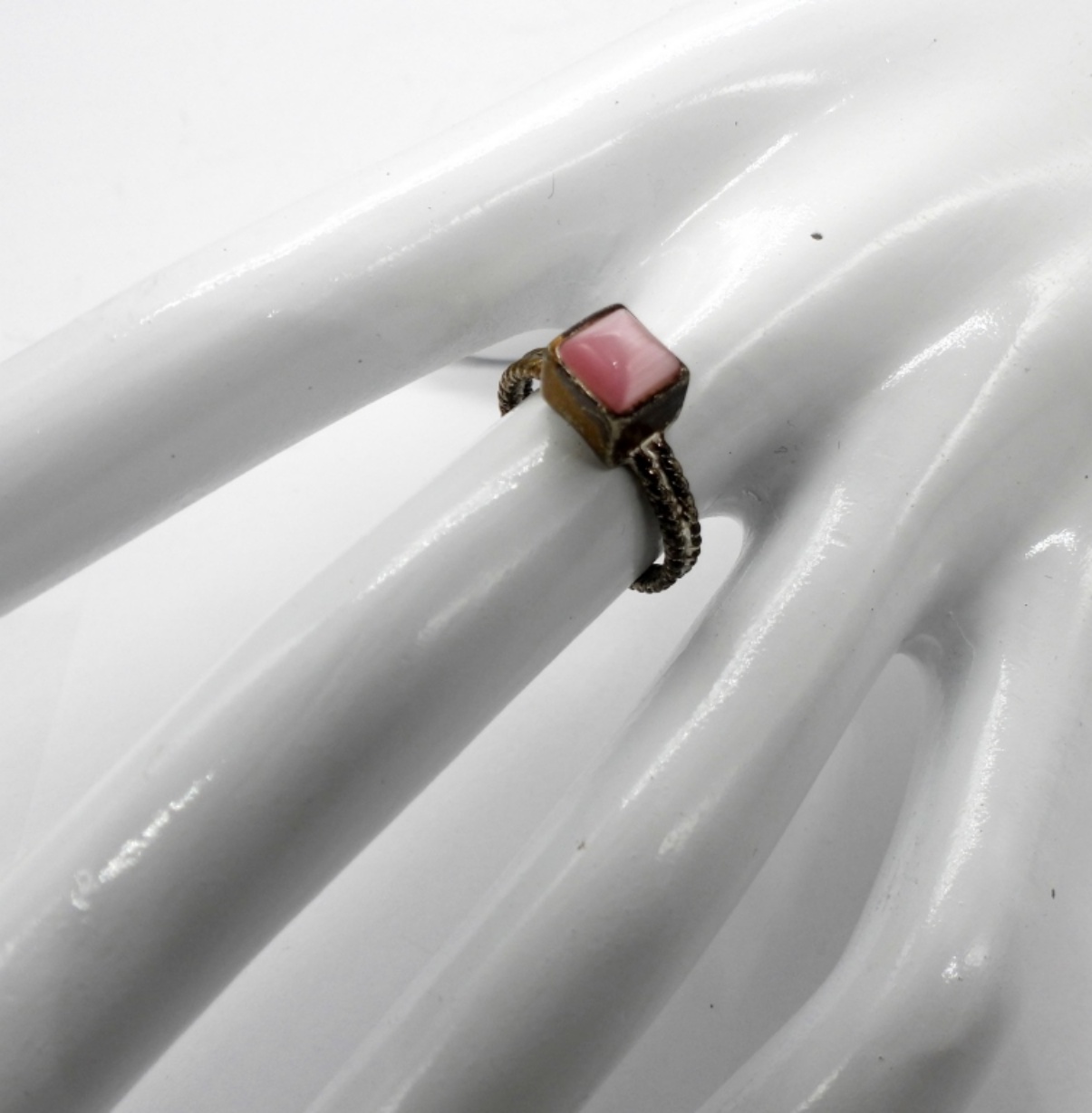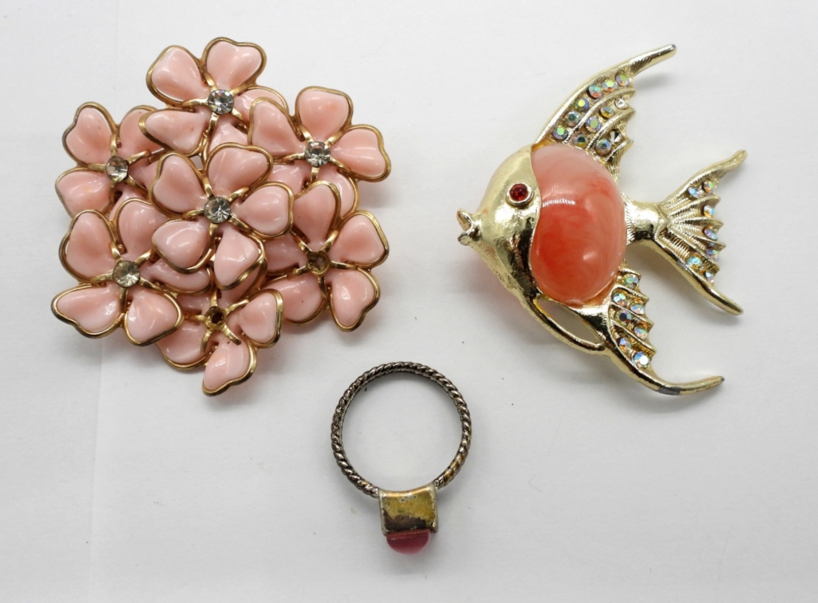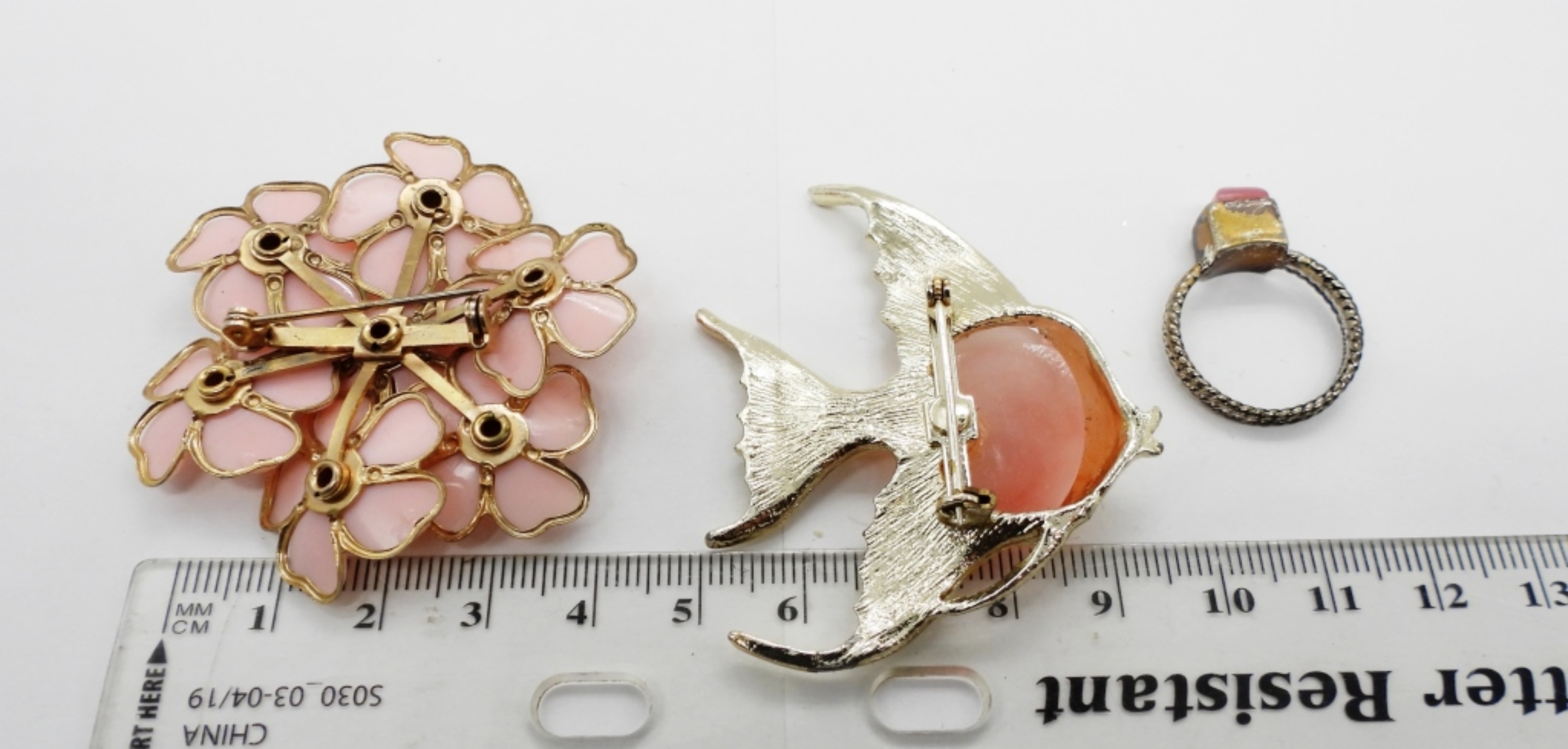 Two Brooches, Floral and Fish in Pink. One Silver Tone Ring with a Pink Cats Eye Gemstone, Size 6.5.
