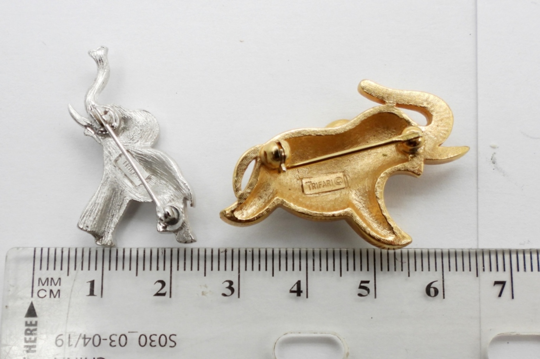 Two TRIFARI Elephant Pins. One is Brushed Silver Tone with a red gemstone eye. The Other is Gold Tone with White Enamel and a Red Gemstone Eye.
