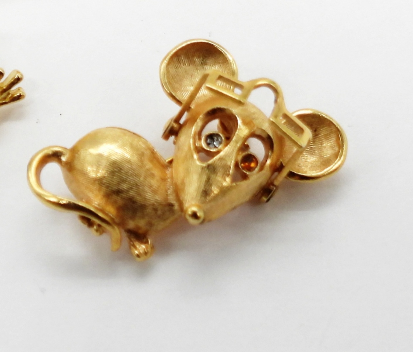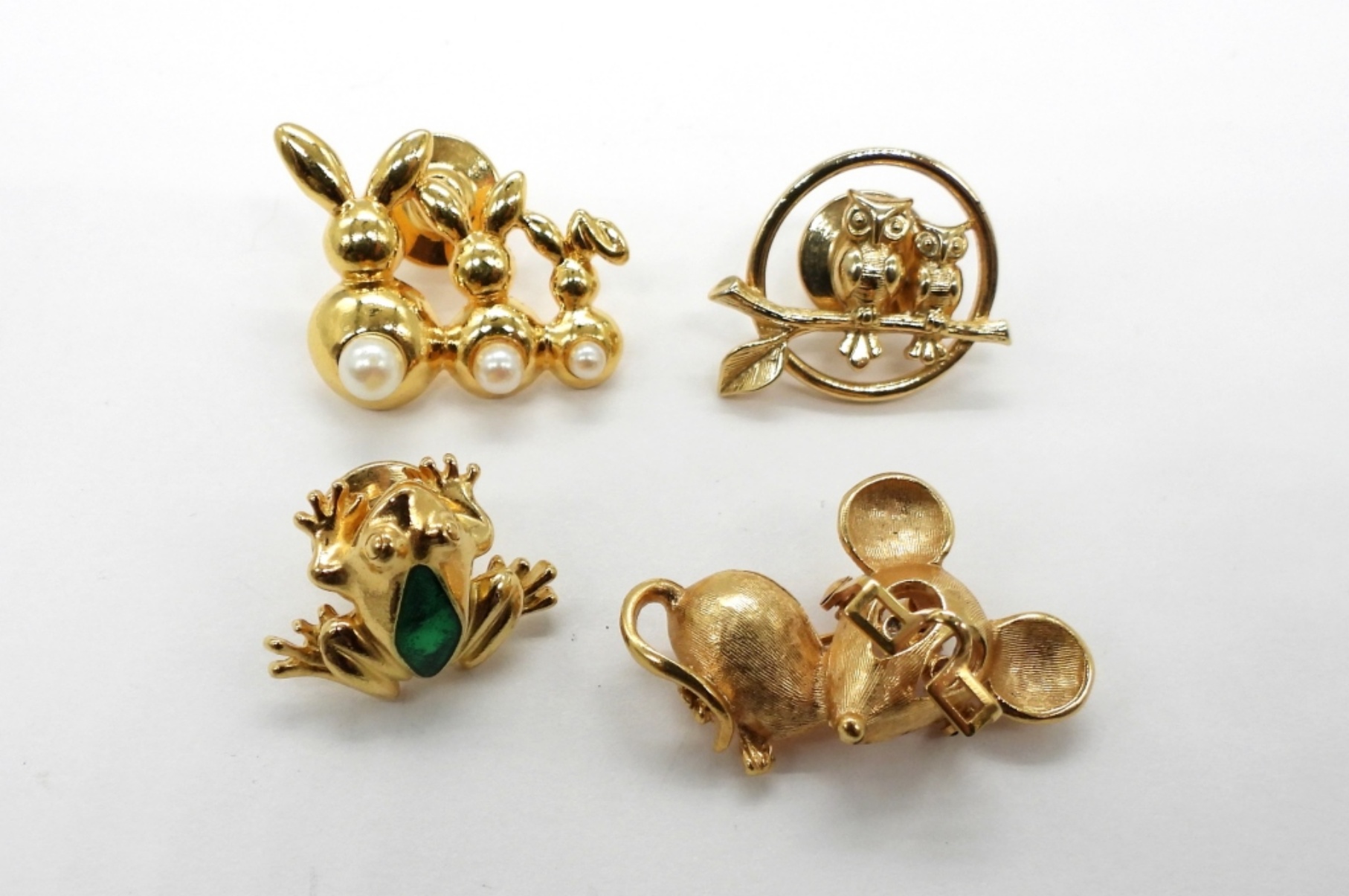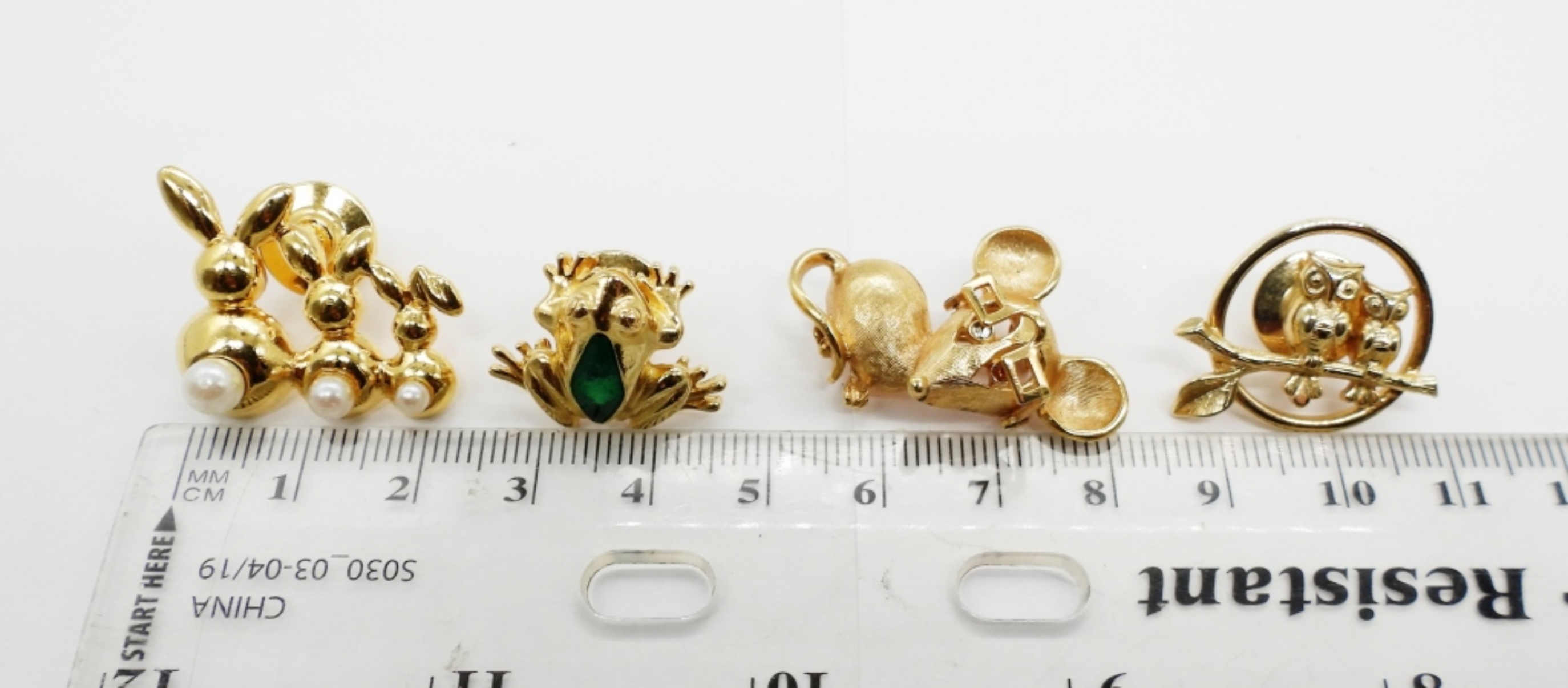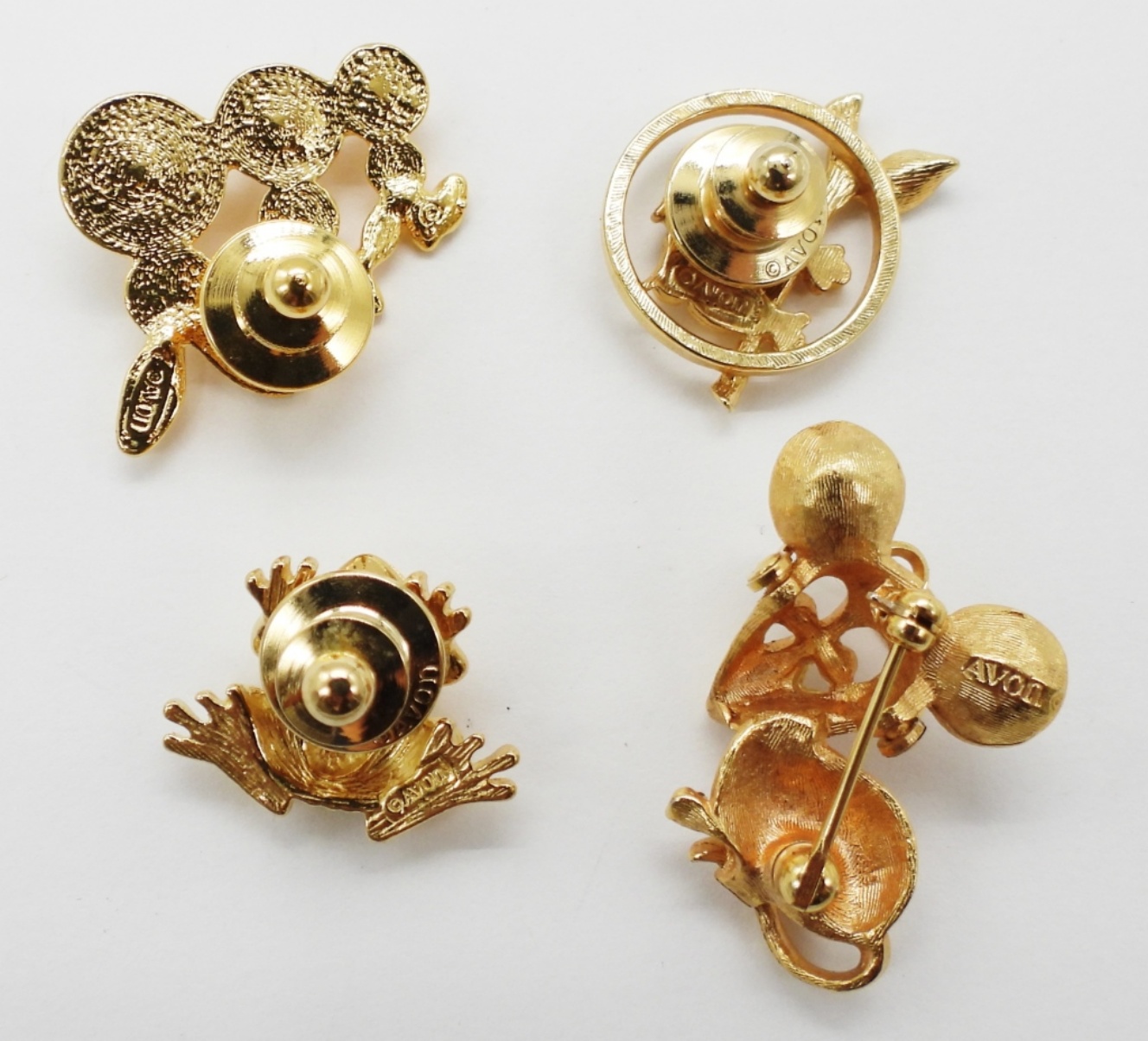 AVON Brand, Gold Tone Pins. Mouse has gemstone eyes, one fell out but it IS in the bag with the pin. Frog, Owl and Bunnies.