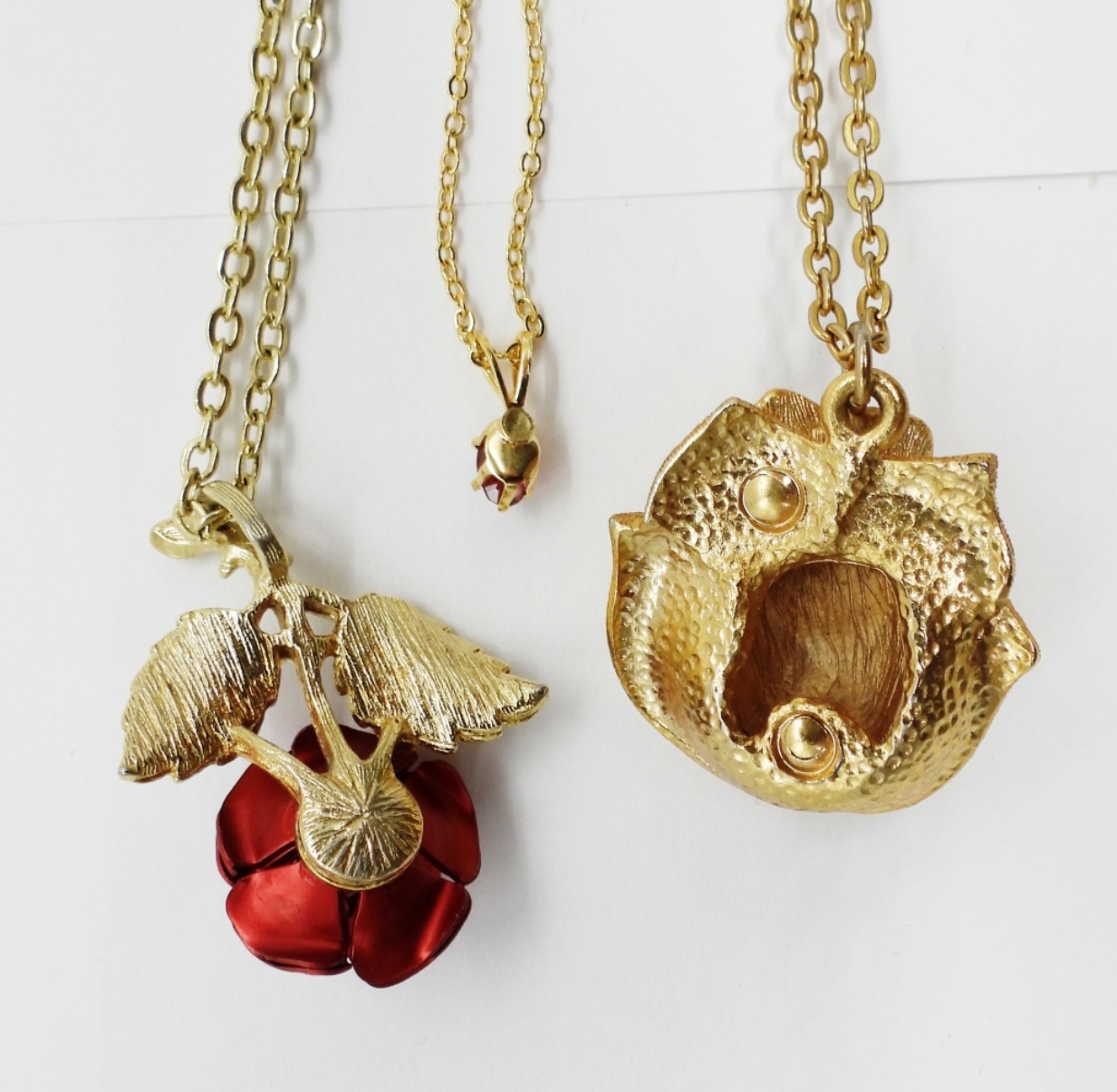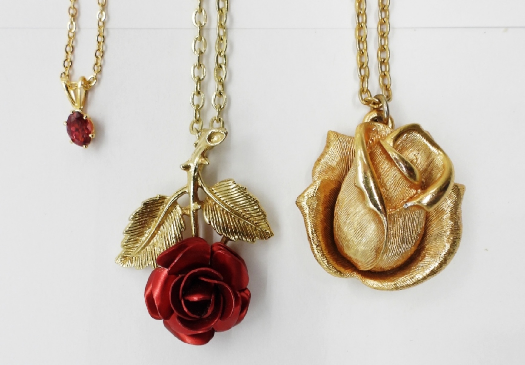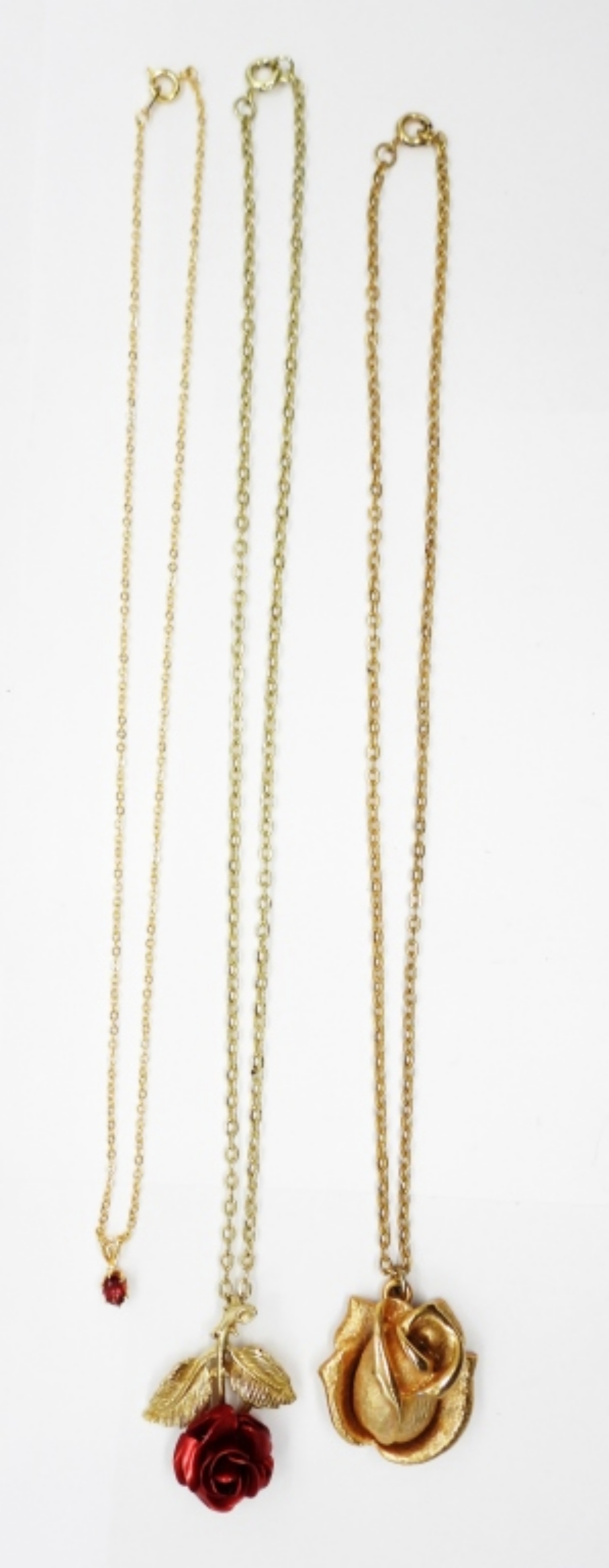 Three Gold Tone Necklaces, Two with Rose Pendants and One Ruby Colored Gemstone. 16″ & 18″.