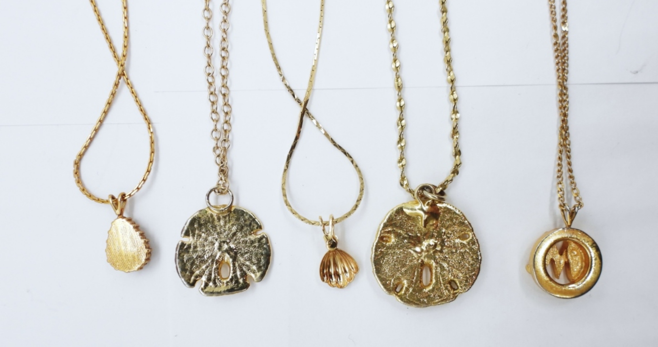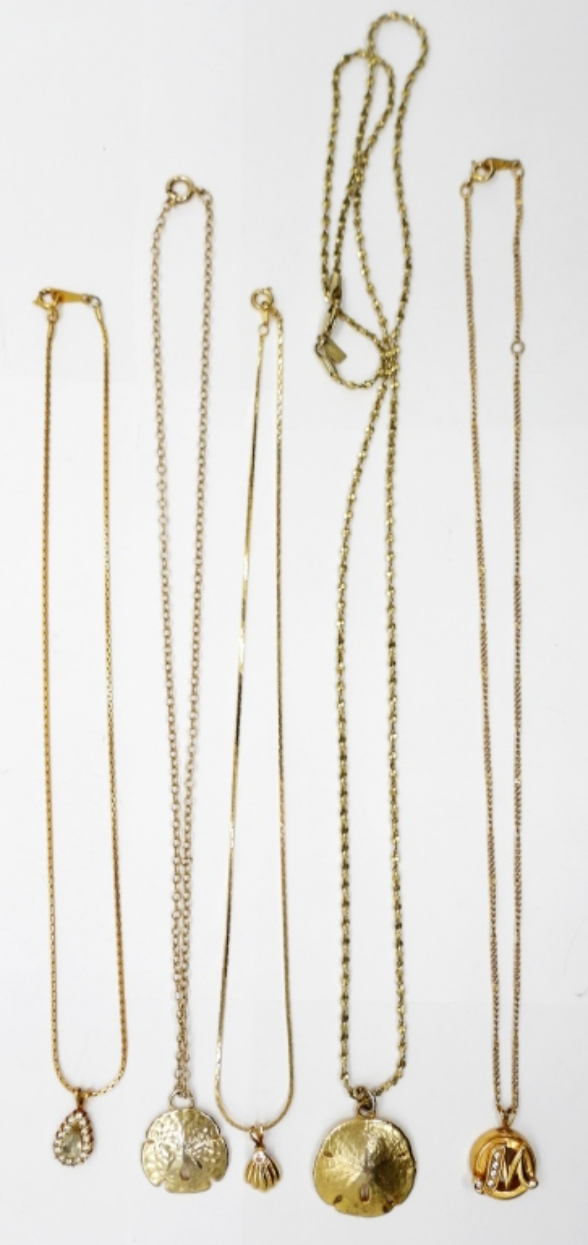 Five Chains with Five Pendants all in gold tone. Chains are Various Styles and Lengths; 14″, 16″, 18″, 25″.