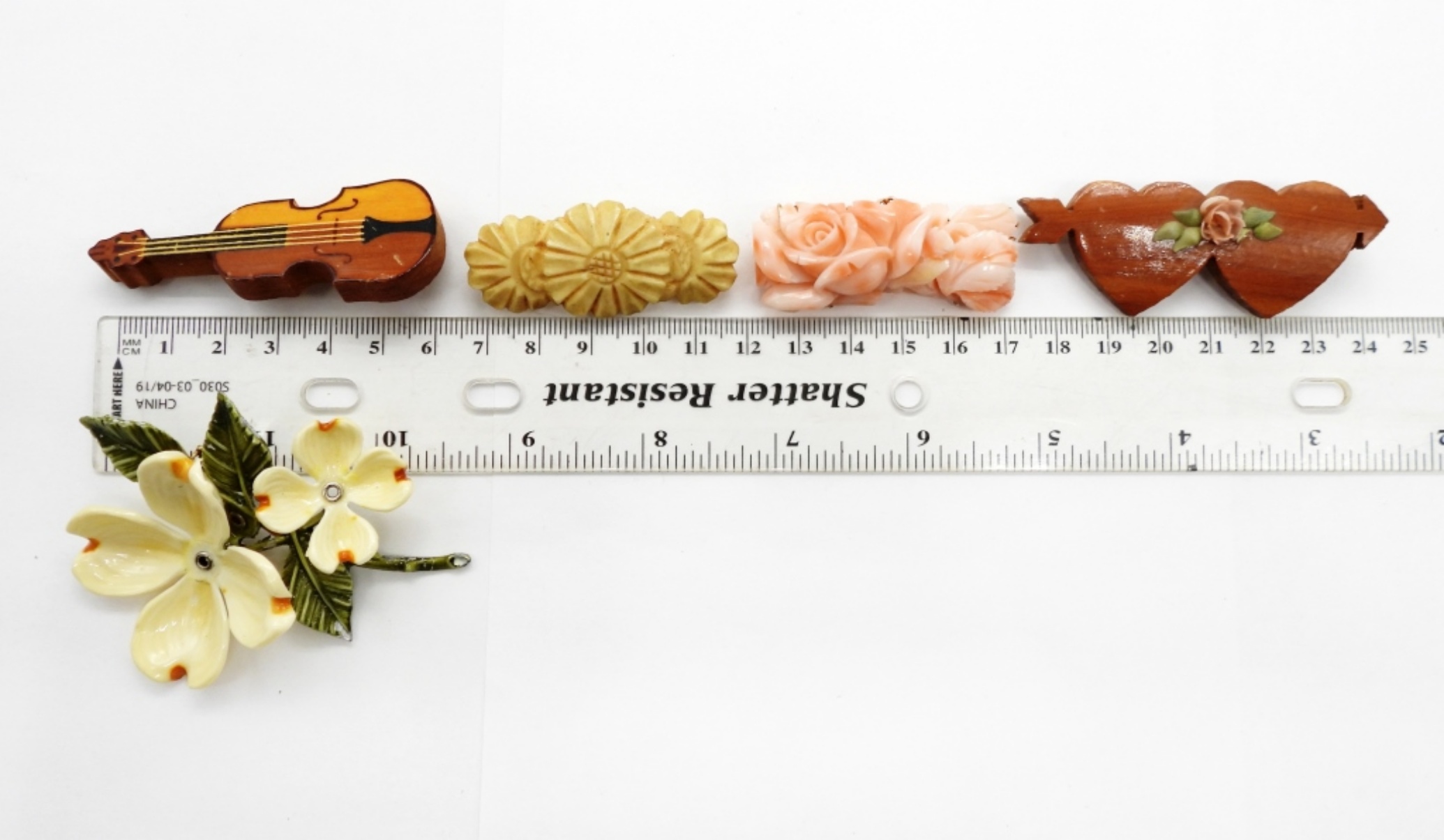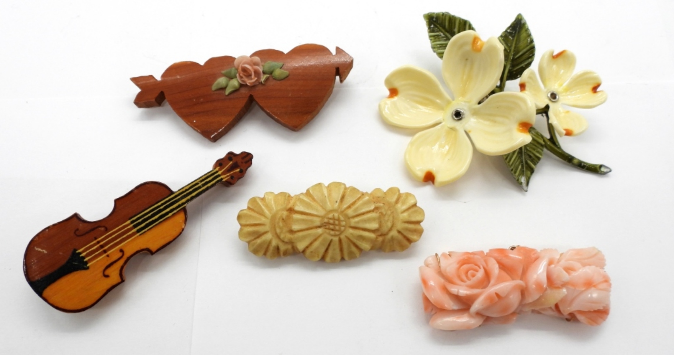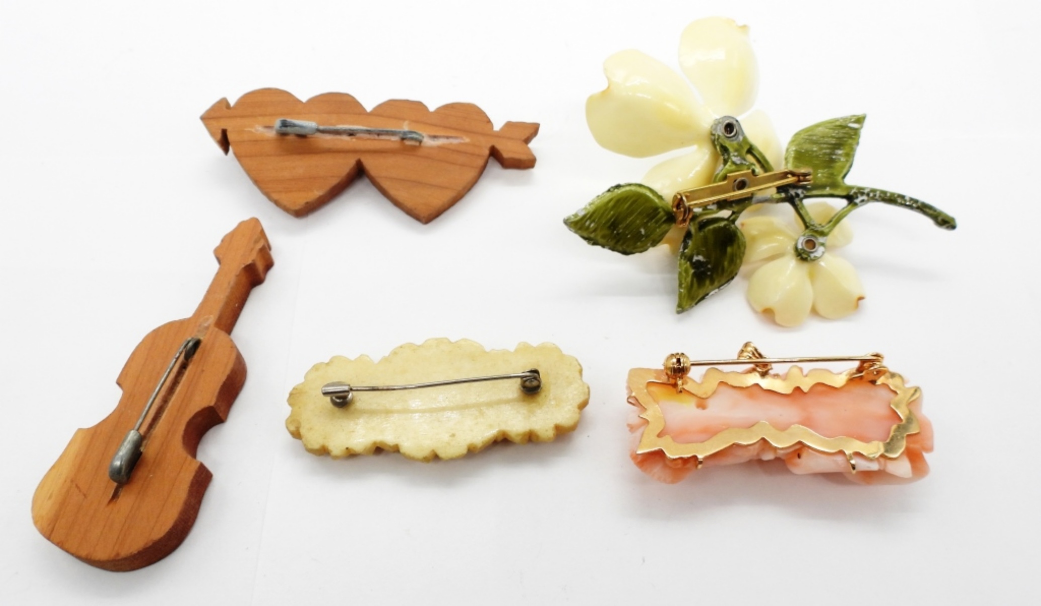 Five Vintage Brooches, Two Homemade Wooden Pins, Two Gemstone Pin and One large Floral Pin (3″x 2″).