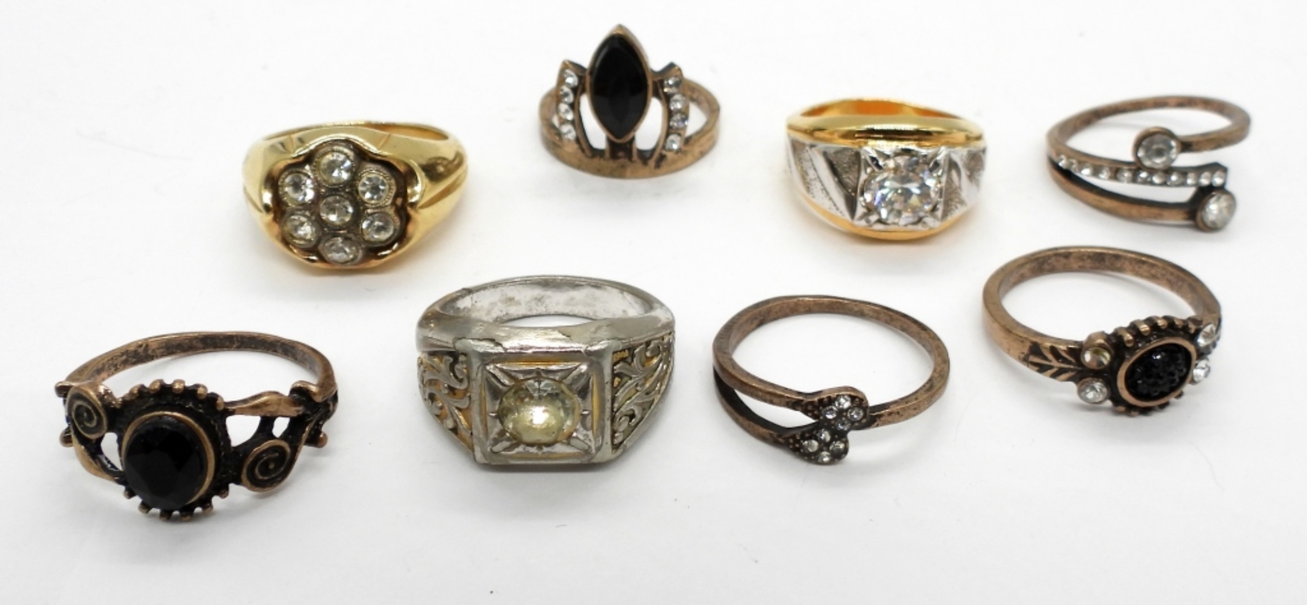 Eight Gold and Silver Tone Rings with Black and White Gemstones. Sizes 9, 9.5 & 10.
