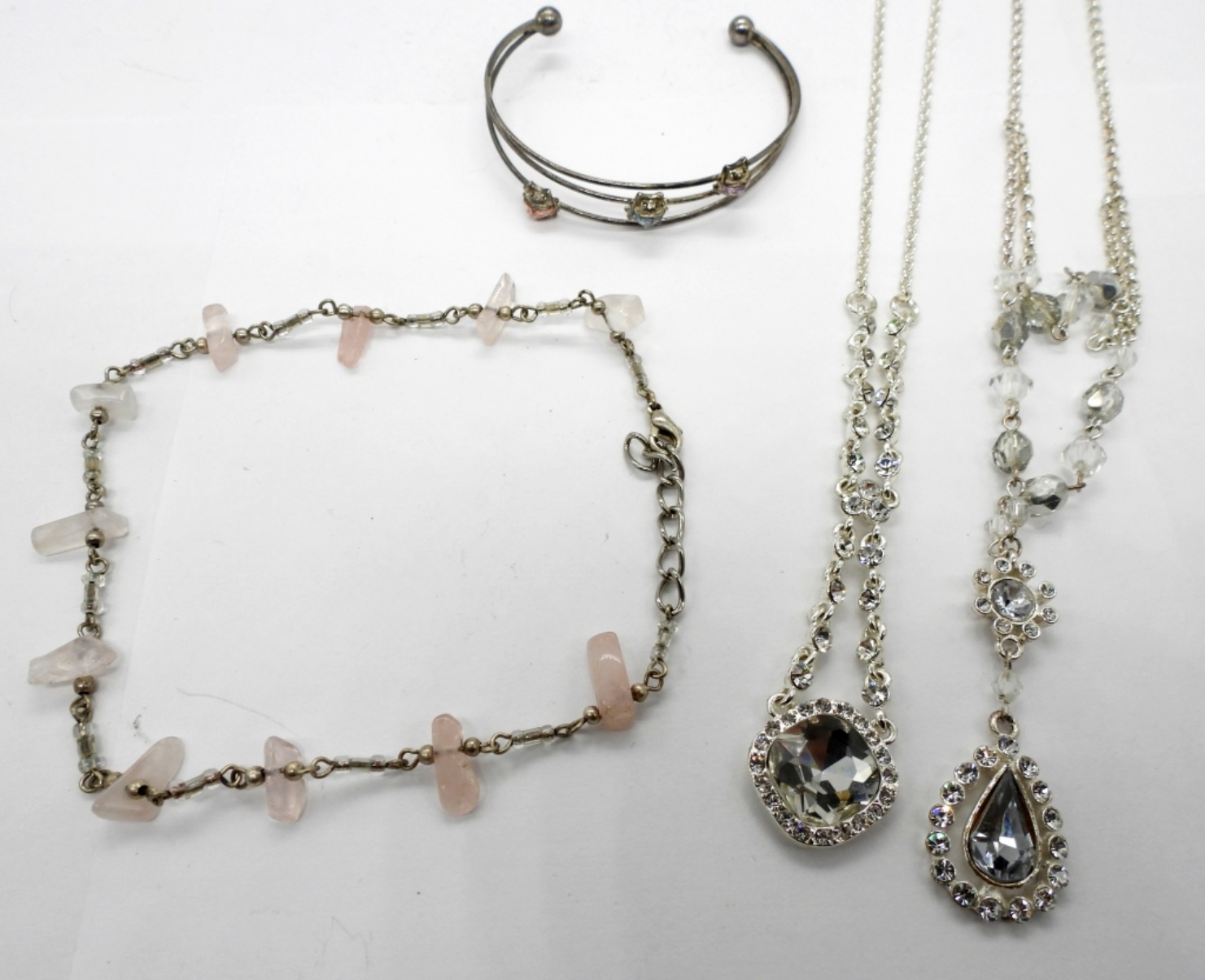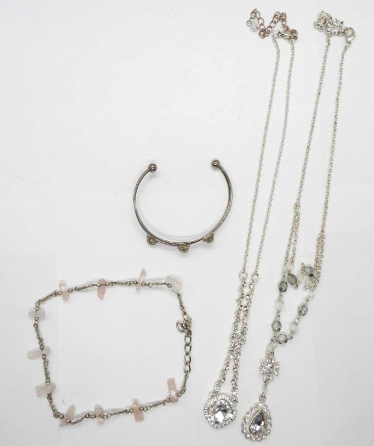 Two Modern, Silver tone Rhinestone Like Necklaces. 16″ & 18″. Silver Tone, 11″ Rose Quartz Ankle Bracelet. Cute Silver Tone Children’s Ladybug Bracelet, 4″.