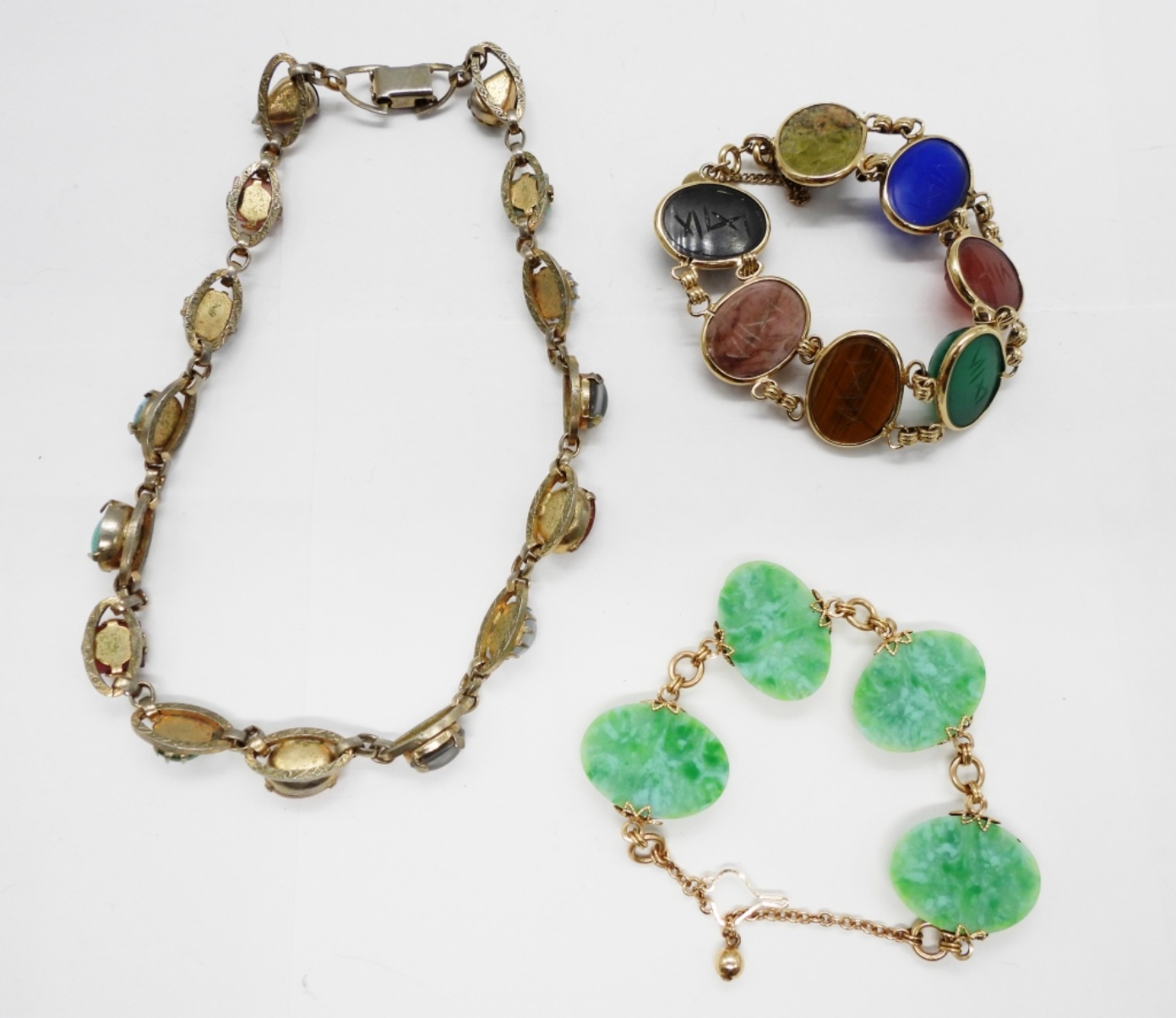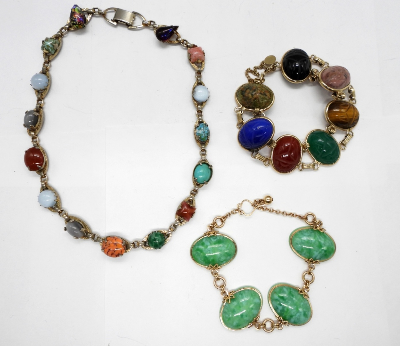 Beautiful Gold Tone Scarab Bracelet, Each Scarab is a Different Gemstone. Marked “1/20-12KGF-CRC”, 7″. Fun Gemstone Necklace, Gold Tone 14″. Gold Tone Bracelet with Green Plastic “Gemstones”, 8″.