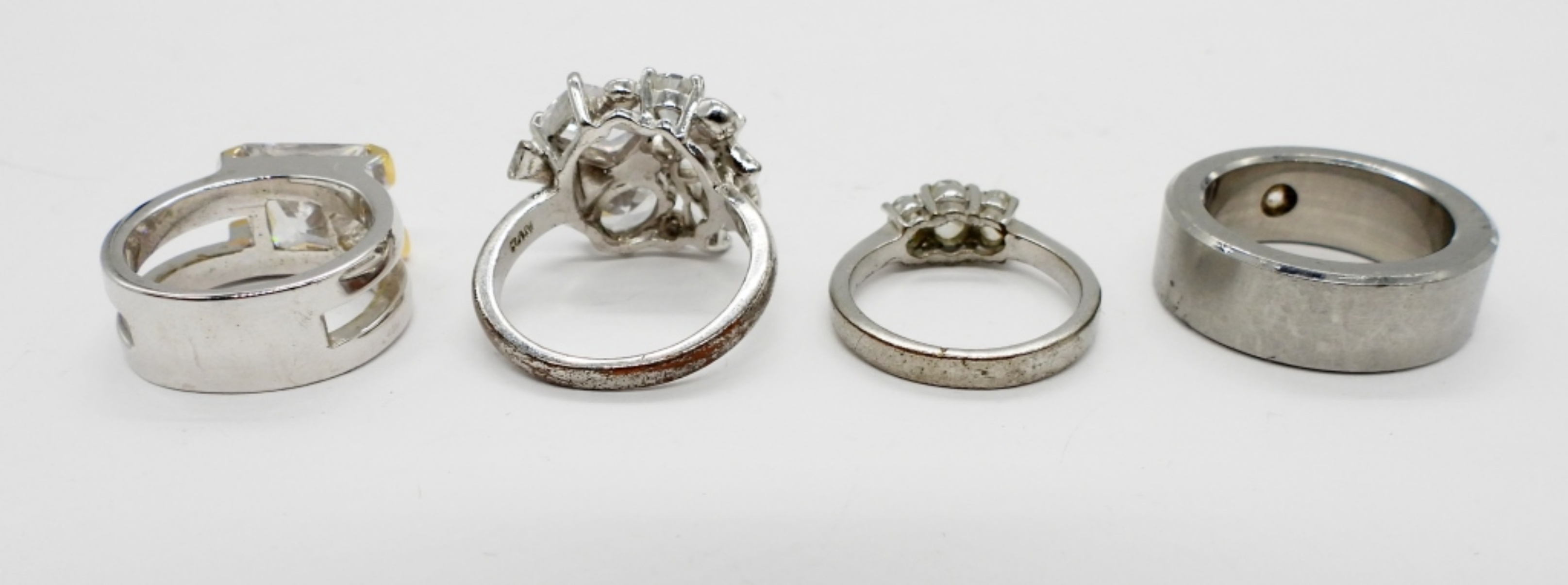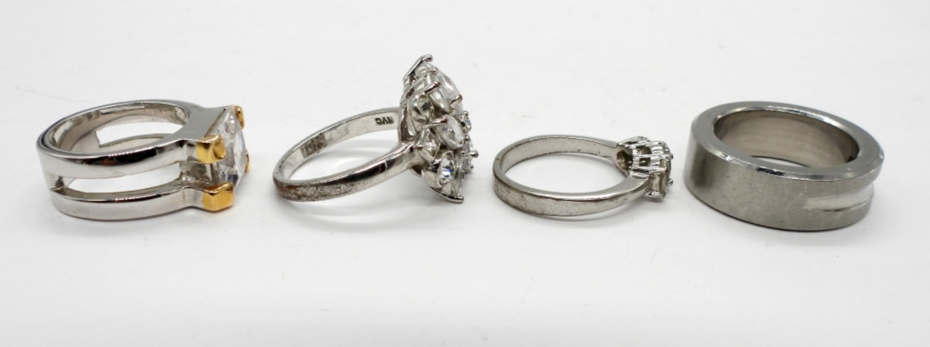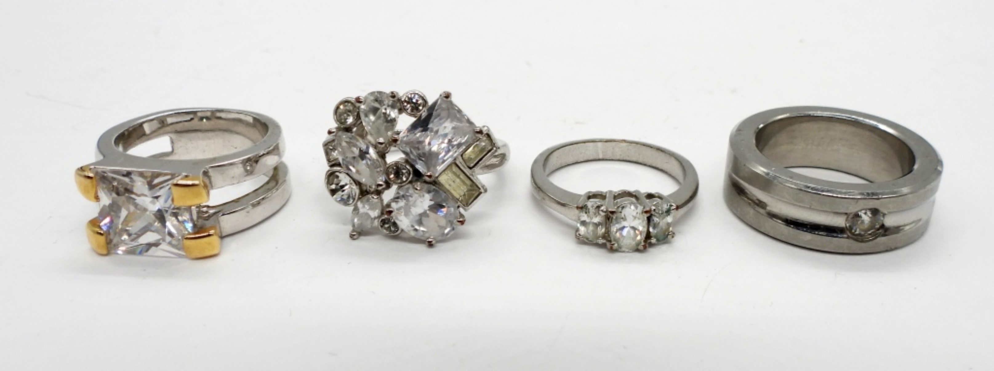 Four Silver Tone Rings with Diamond Like Gemstones. Sizes are 5.5, 7, 8, 9.