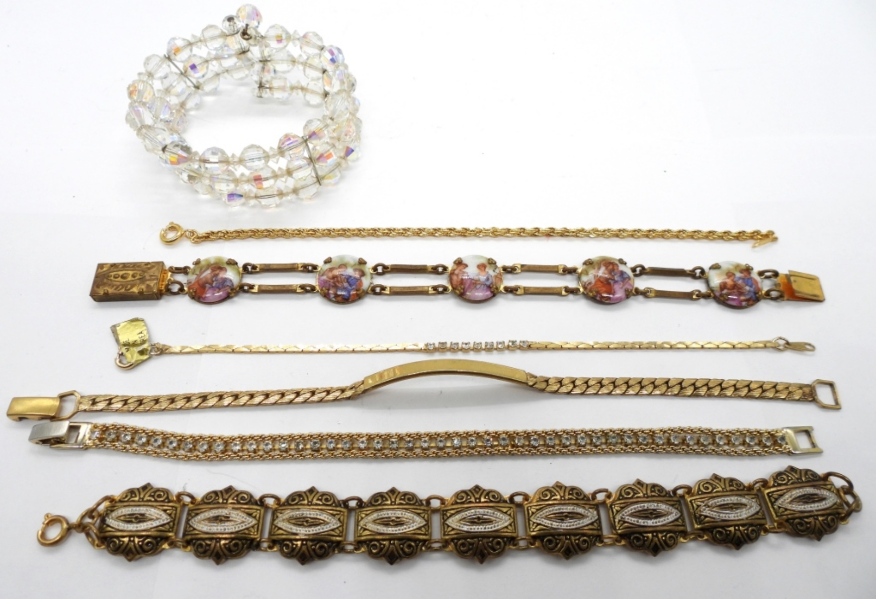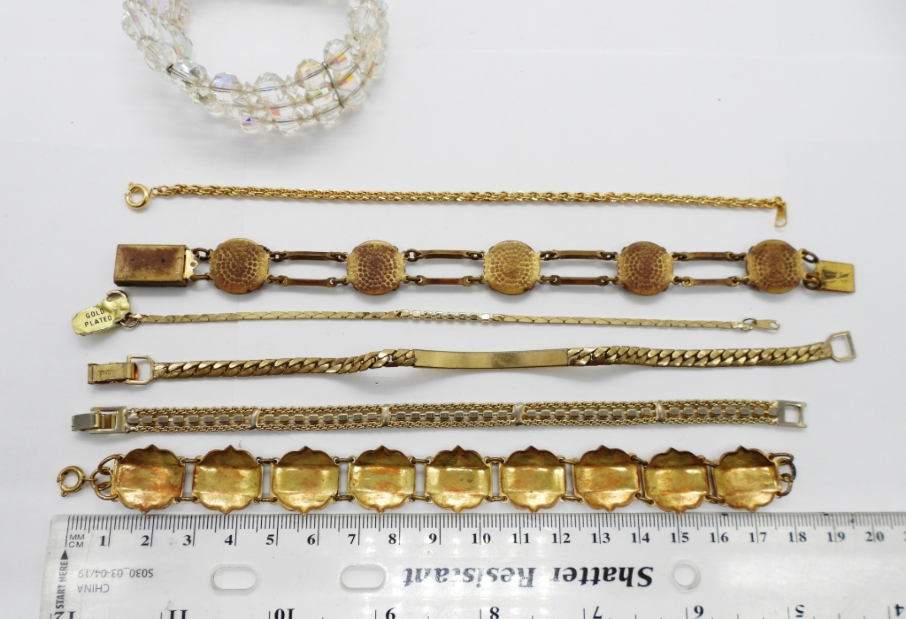 Six Vintage Gold Tone Bracelets, 7″ & 8″. Very Pretty, One Still has it’s Tag! One Vintage Crystal Bead Bracelet, 7″ but could fit most.