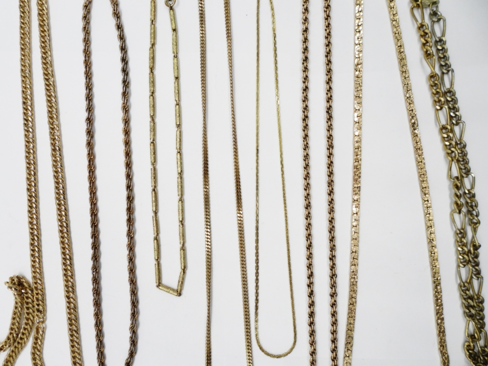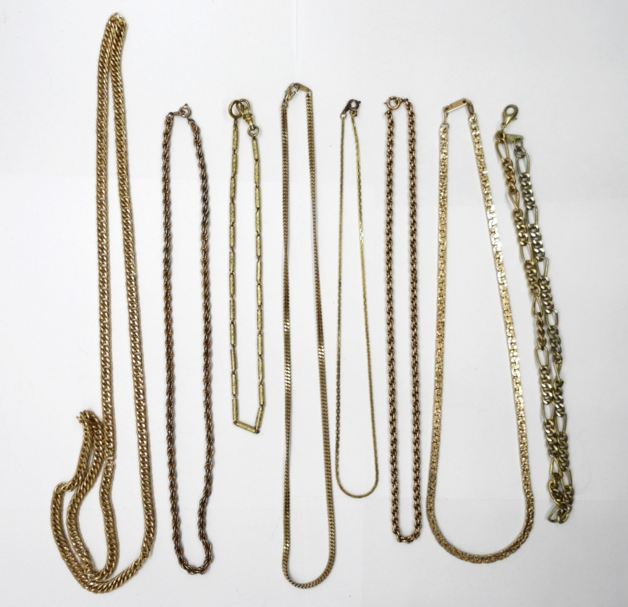 Eight Gold Tone Chains. Lengths are 12.5″, 15″, 15.5″, 17″, 18″, 18.5″, 20″, 30″.