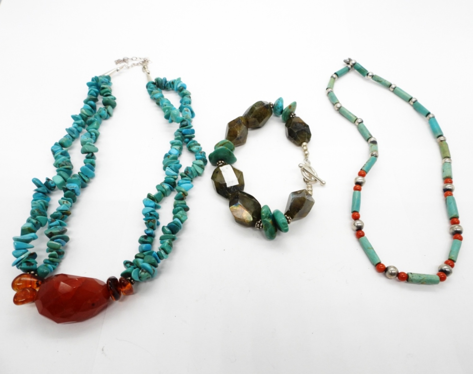 Silver Tone Turquoise Chip Beaded Necklace with a nice Carnelian Center Stone, 18″. Turquoise and Red Coral Beaded 16″ Necklace. Labradorite and Turquoise Bracelet, 8″.