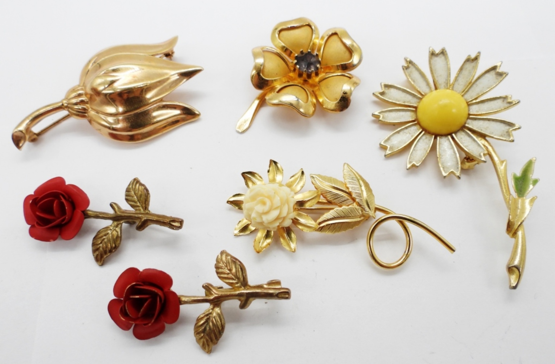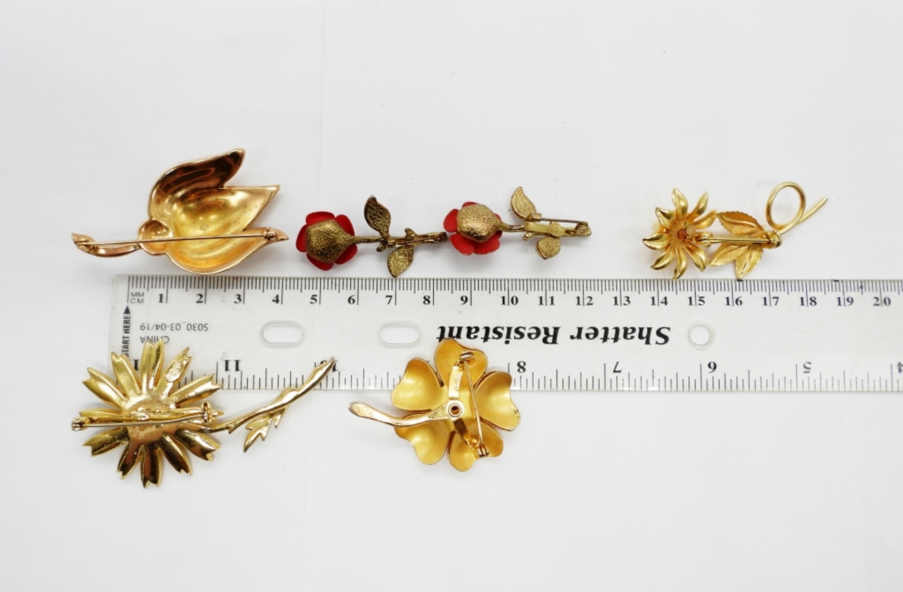 5 Vintage Gold Tone Brooches. CORO Brand, Gold Tone Flower Brooch with Smokey Quartz Colored Gemstone. WEISS Brand, Gold Tone Enamel Daisy Pin, 2.5″x 1.5″. Two Gold Tone Red Rose Pins. Gold Tone White Flower Pin,