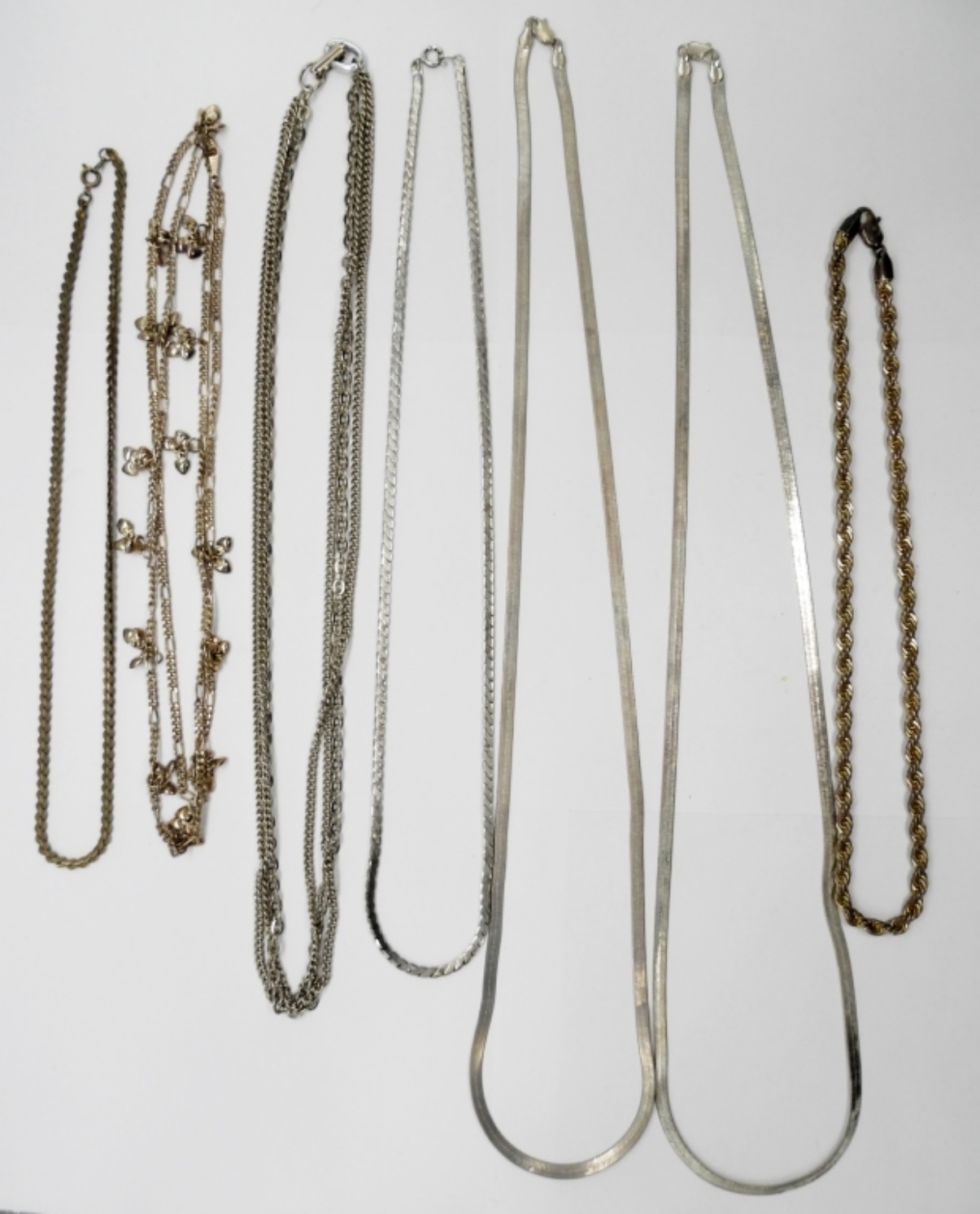 Seven Vintage Silver Tone Chains of Various Styles. 18″, 22″, 24″, 36″.
