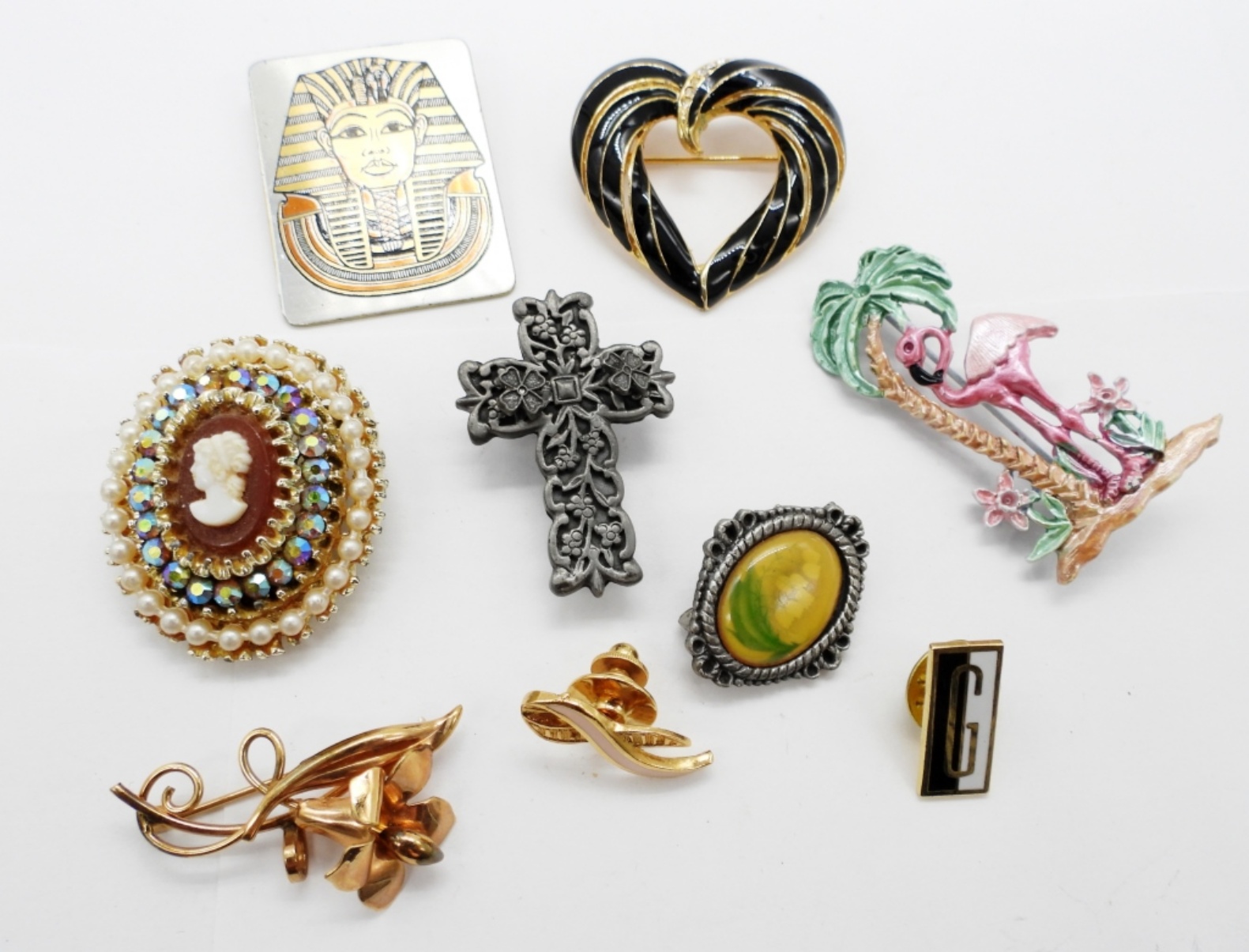Reed & Barton Damascene Egyptian Brooch / Pendant. 1.5″x 1 1/4″. Vintage Carl Art 1/20K G.F. Lilly Brooch / Pendant, 2″. Other brooches include Flamingo, Cross (with earrings), Heart and Tulip Portrait.
