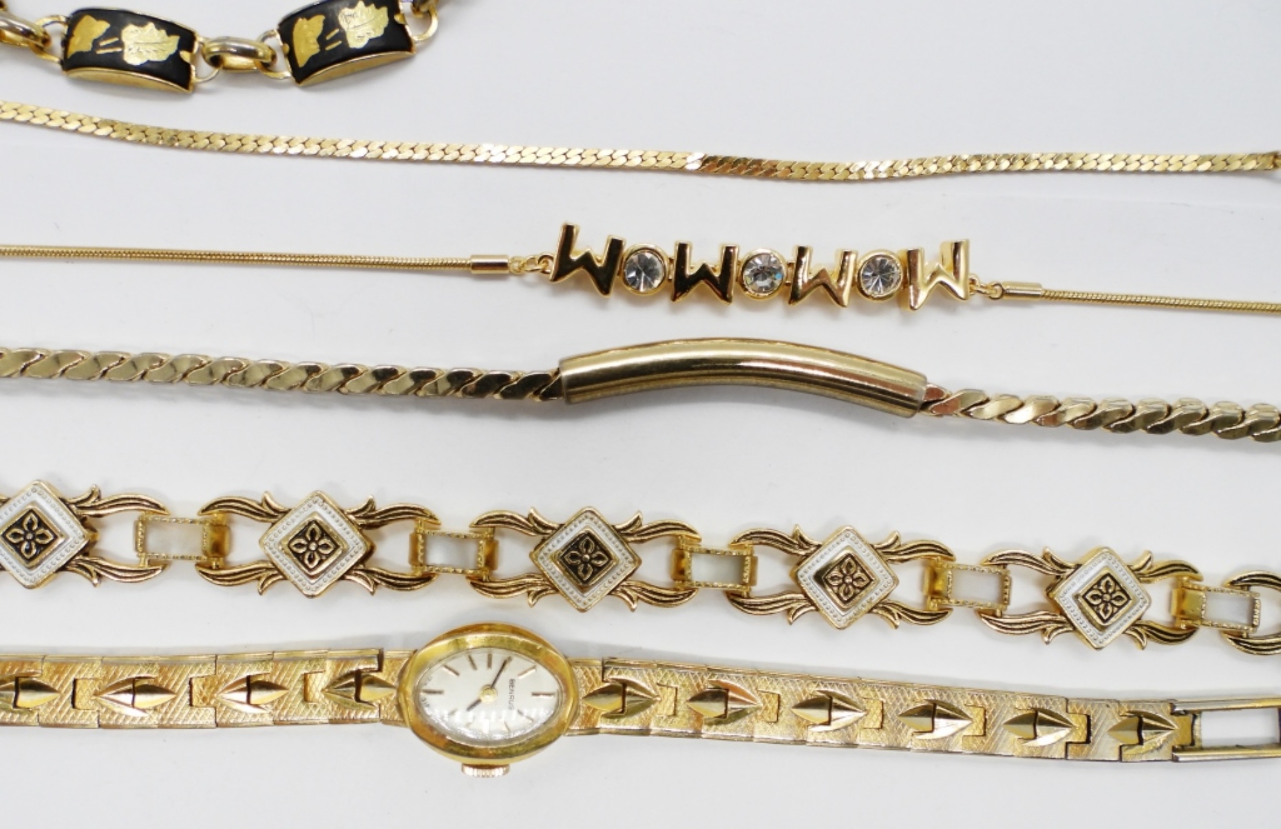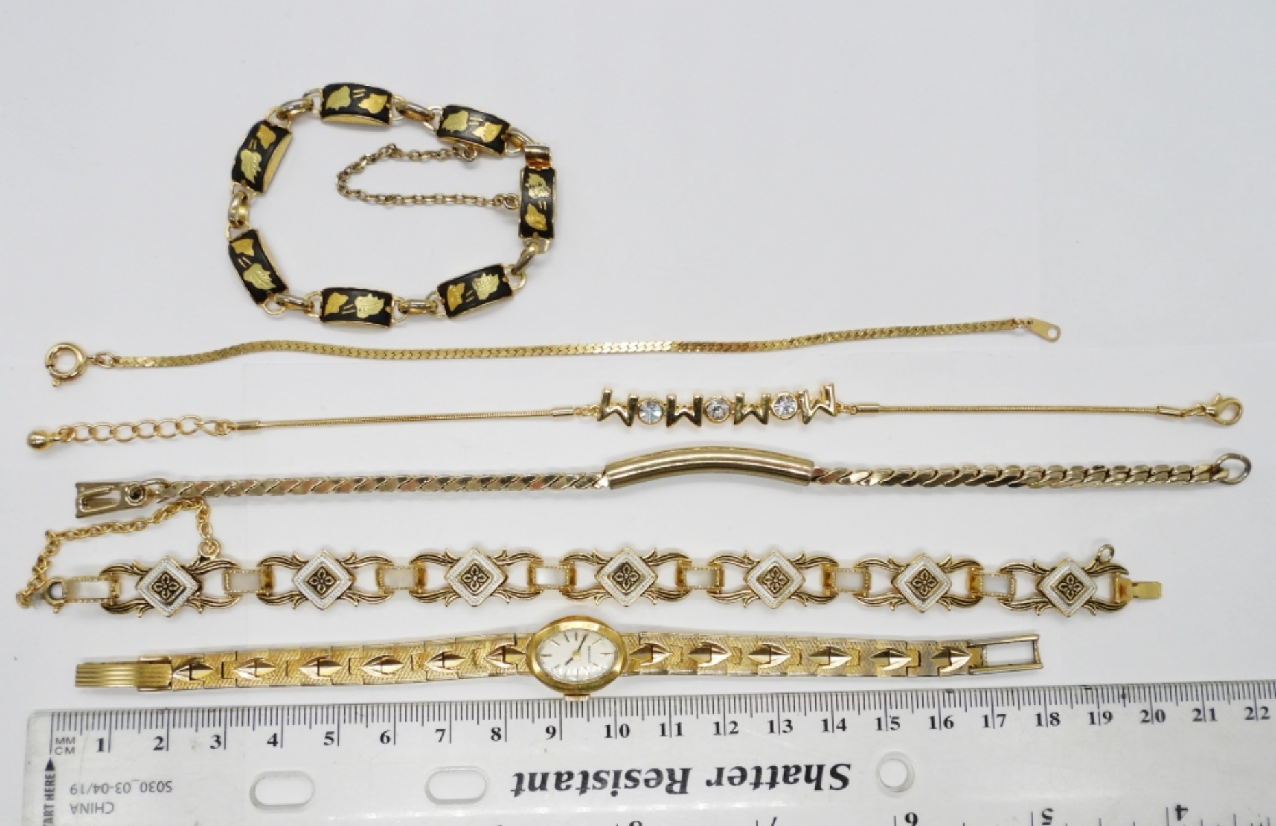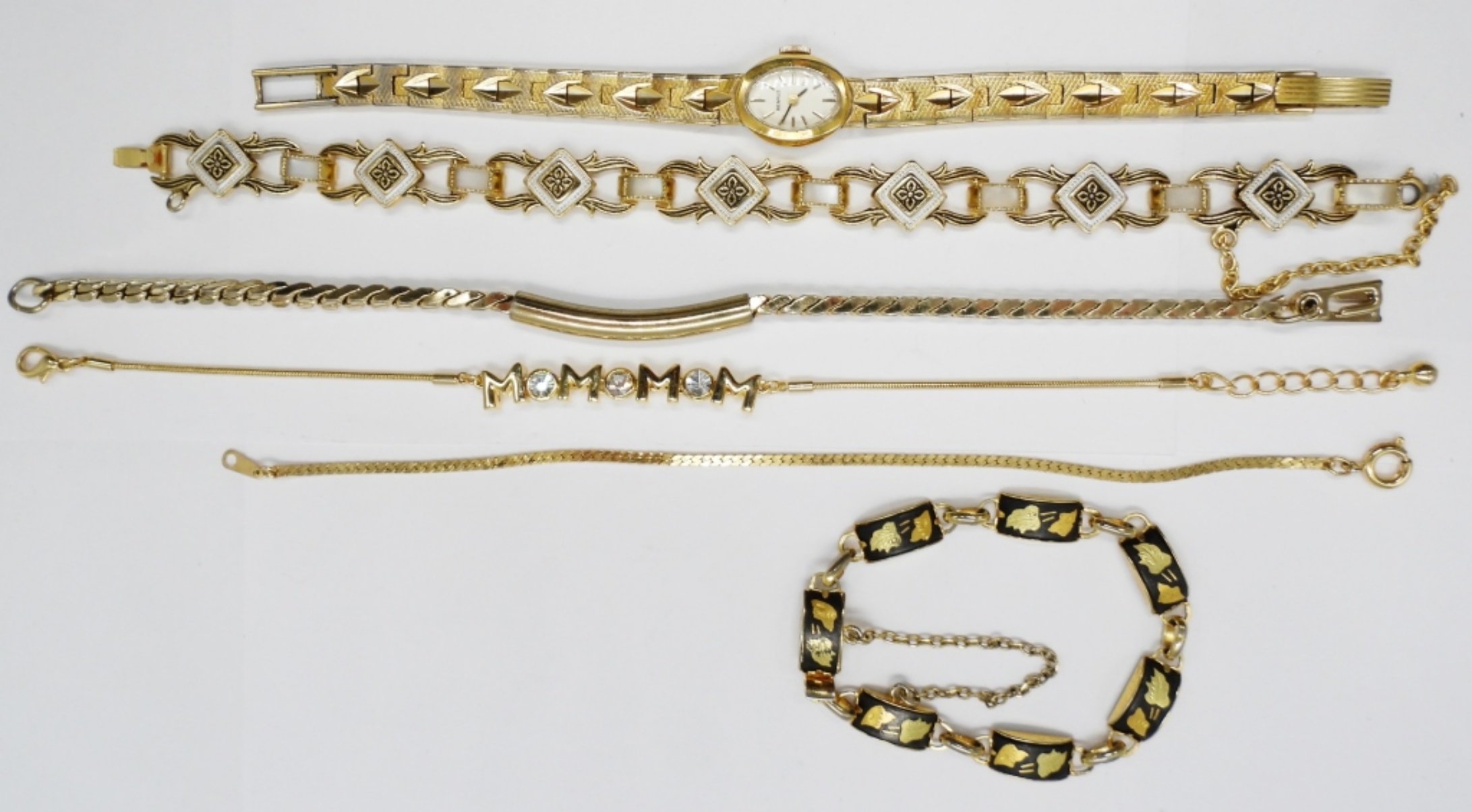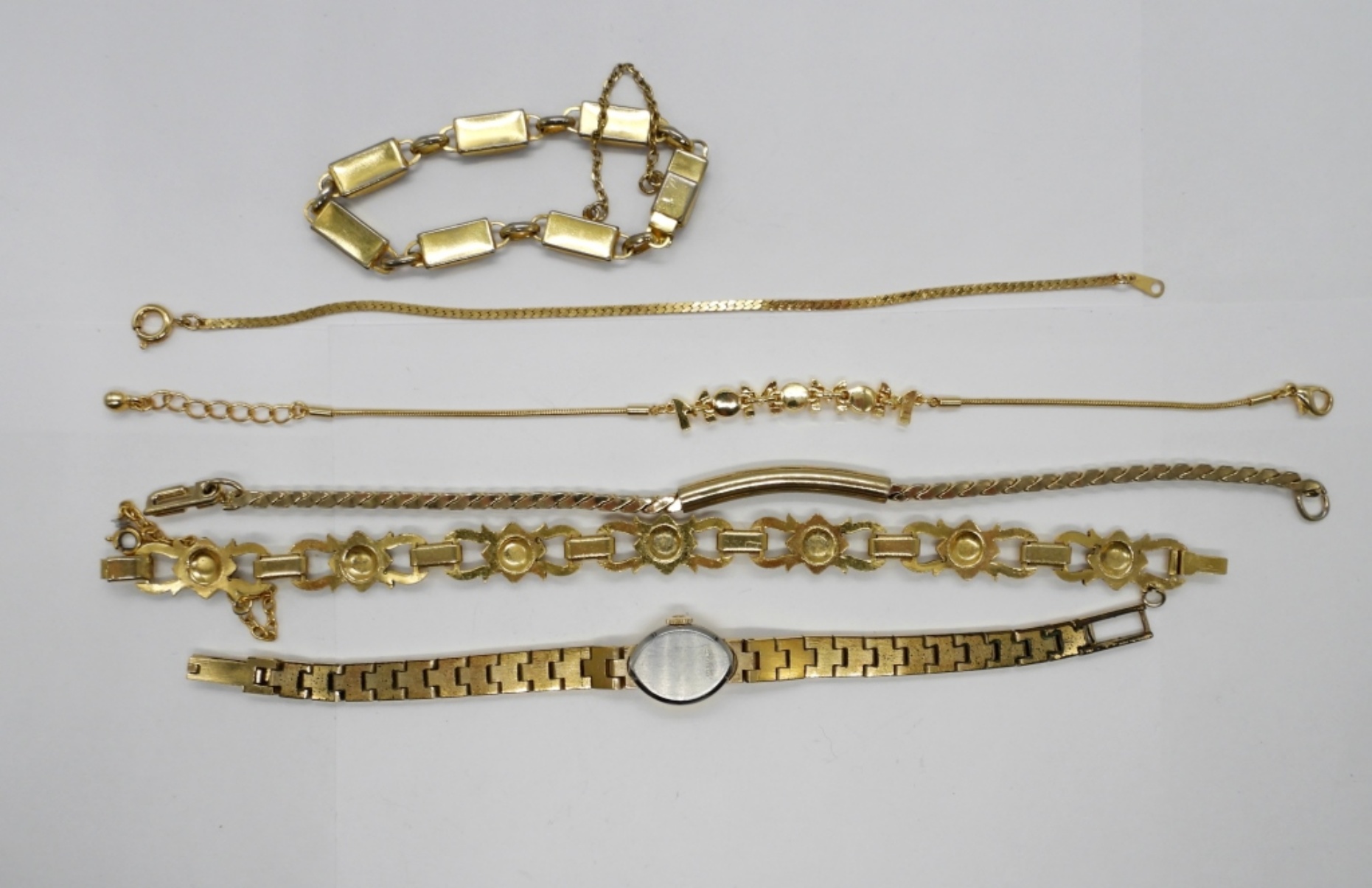 Vintage Gold Tone Bracelets and Vintage Gold Tone “Benrus” Watch with a Diamond Cut Band, 7″. Bracelets measure 7, 7.5, 8.5, & 9.