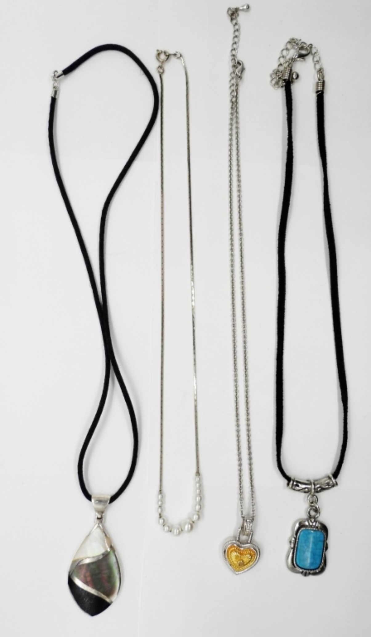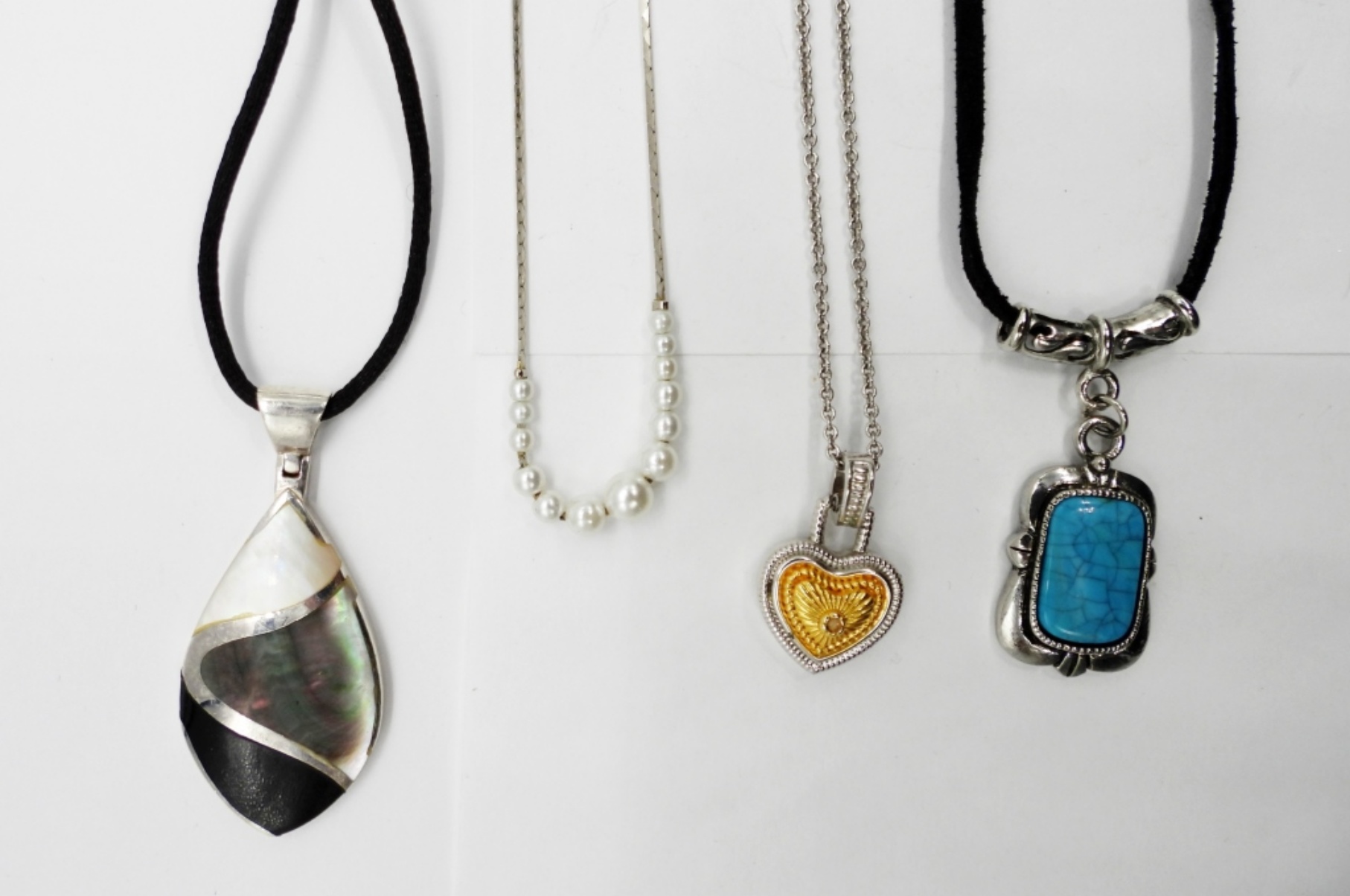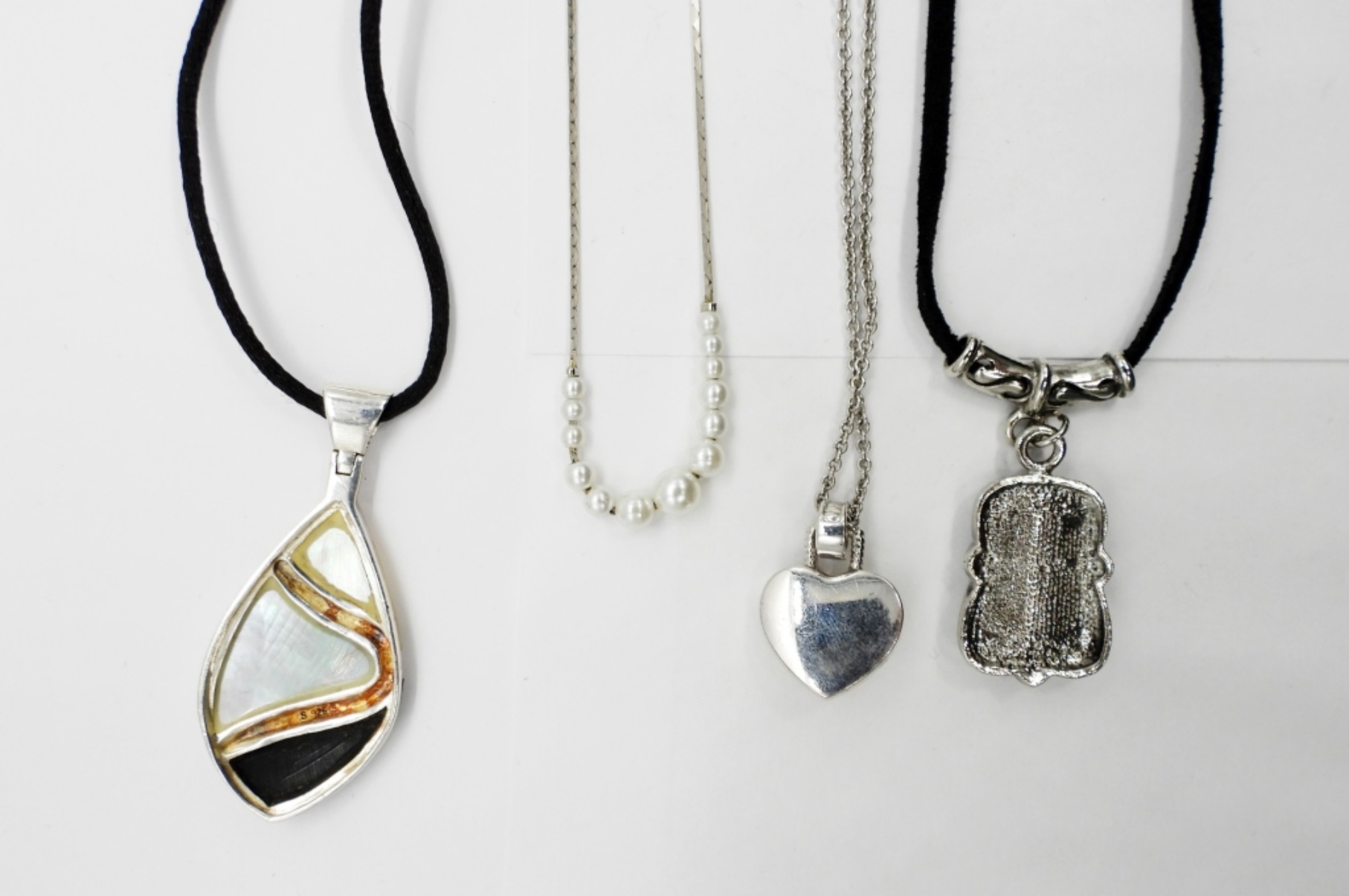 Four Silver Tone / Chain / Black Cord Necklaces. Lengths are 18″ & 20″.