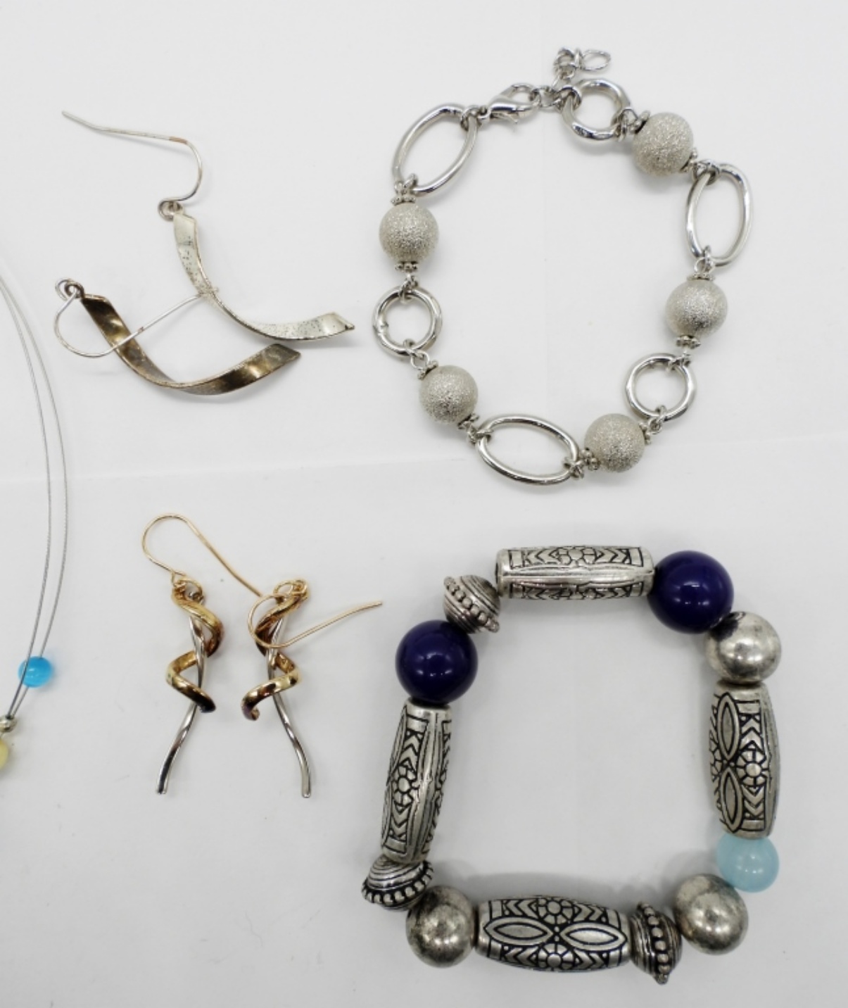 Silver tone Modern Fashion Jewelry. Stretchy Bracelet 7″. All Silver Tone Bracelet, 7″-8″. Wire Bead Necklace is 19″.