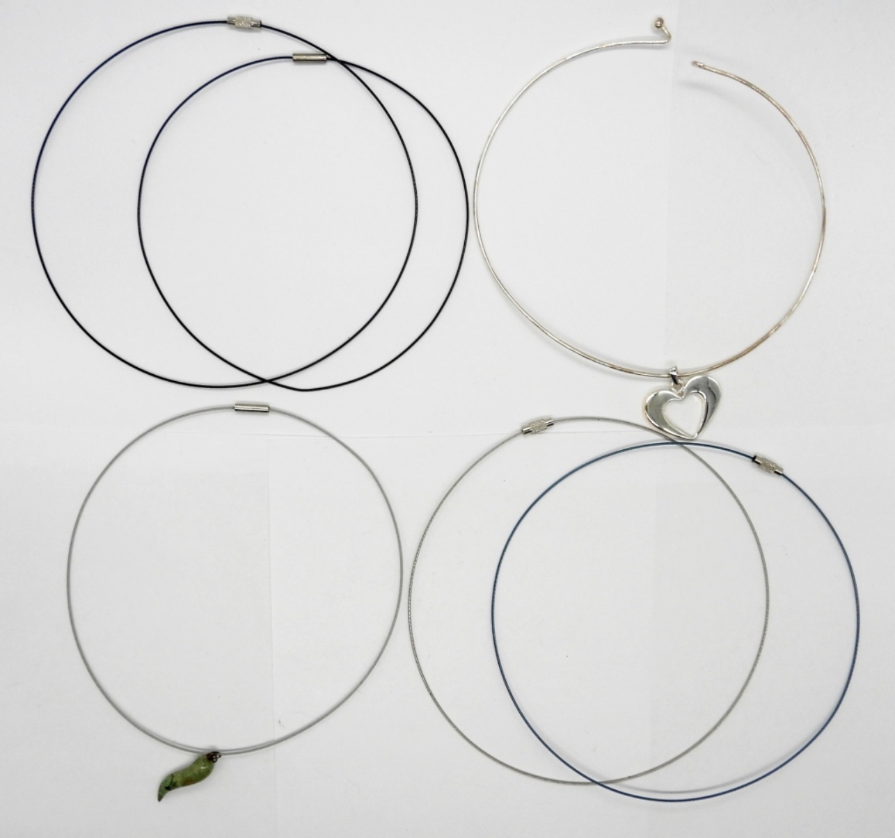 Six Wire Collar Necklaces in Silver Tone, Blue & Black. Two Pendants.