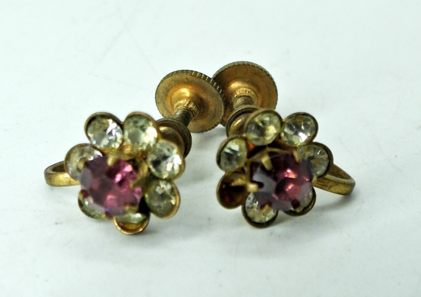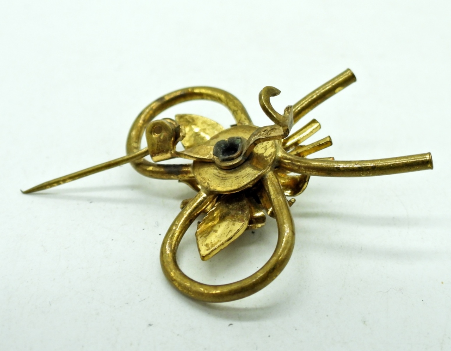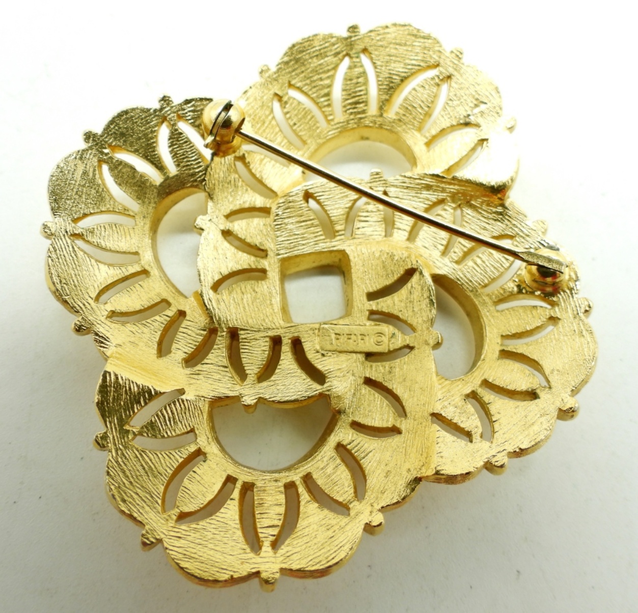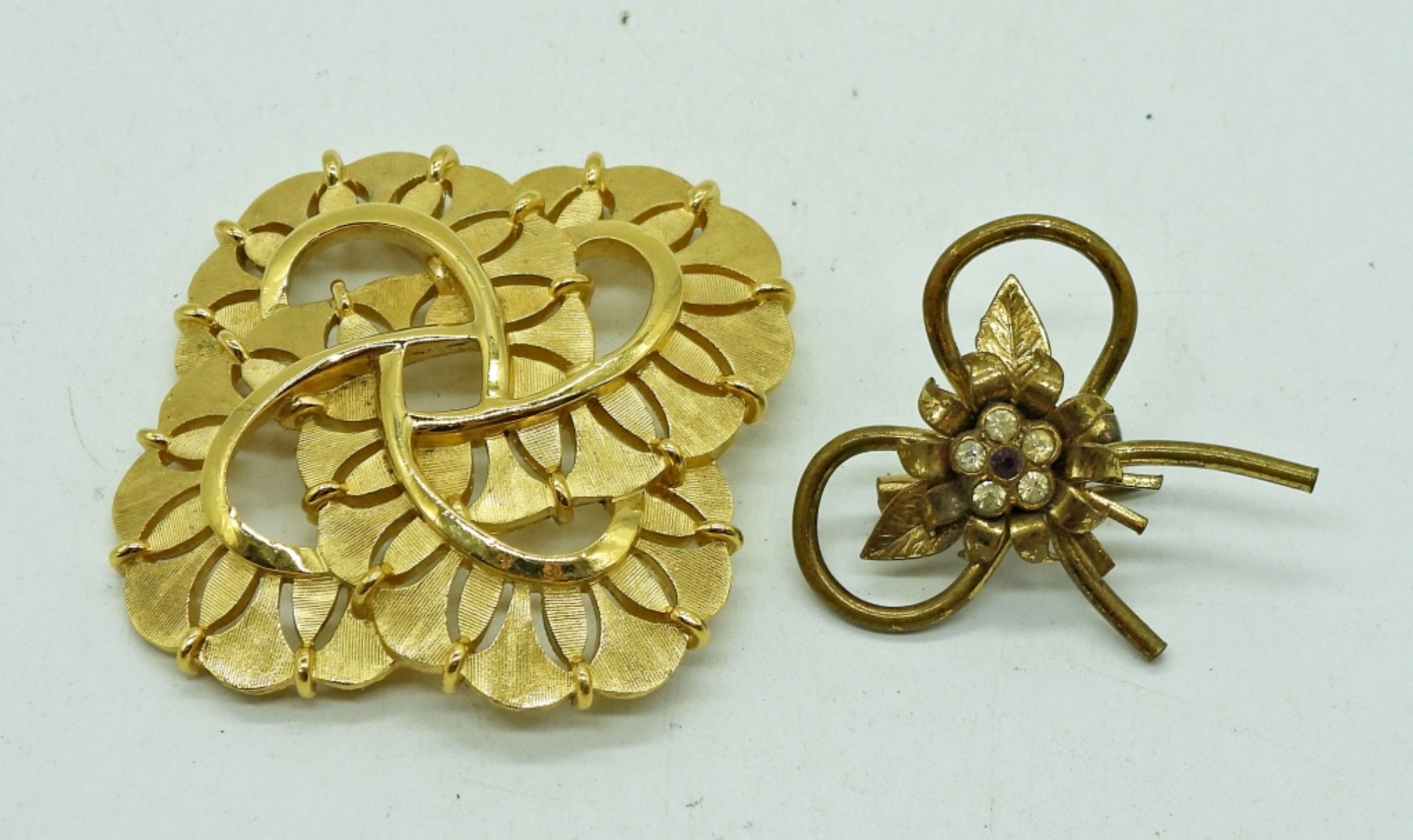 Vintage Trifari Ornate Brushed Gold Tone Interwoven Knotwork Pin Brooch, 1 3/4″. Vintage Coro Gold Tone Bowtie Flower Pin – THE BACK IS TWISTED, CAN BE FIXED! Vintage Gold Tone Screw Back Earrings with Purple