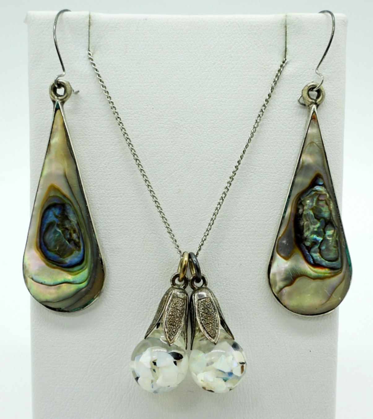 Two Identical “Floating Opal” Pendants in Silver Tone, a 16″ chain and a pair of “Mexico” Abalone Pierced Earrings.