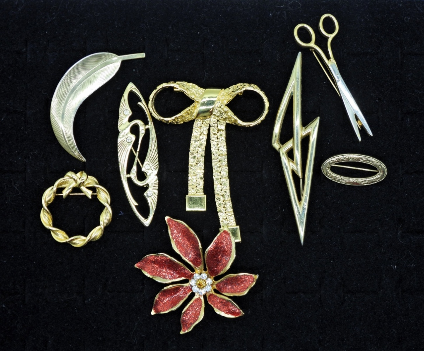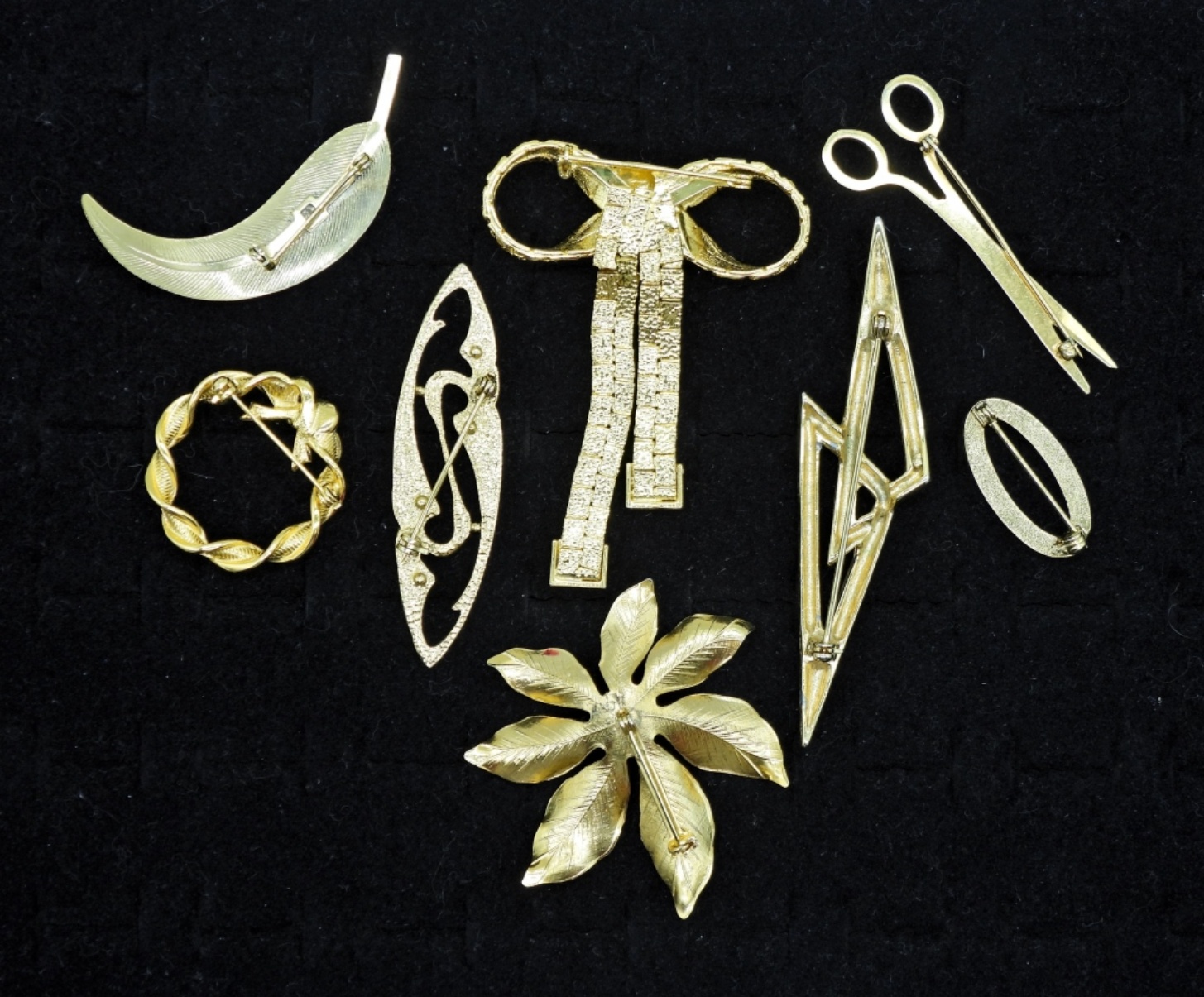 Eight Gold Tone Vintage Brooches. Poinsettia 2″. Bow 3″x 2″. Scissors 2.5″. Feather 2.5″. Geometric 4″.