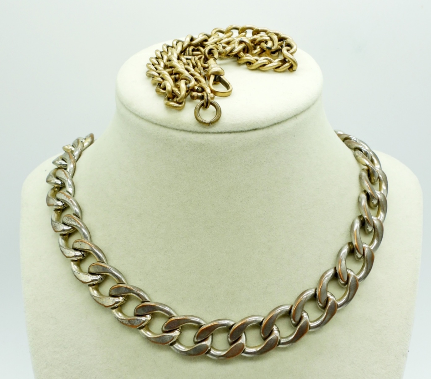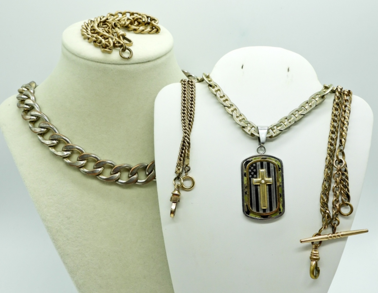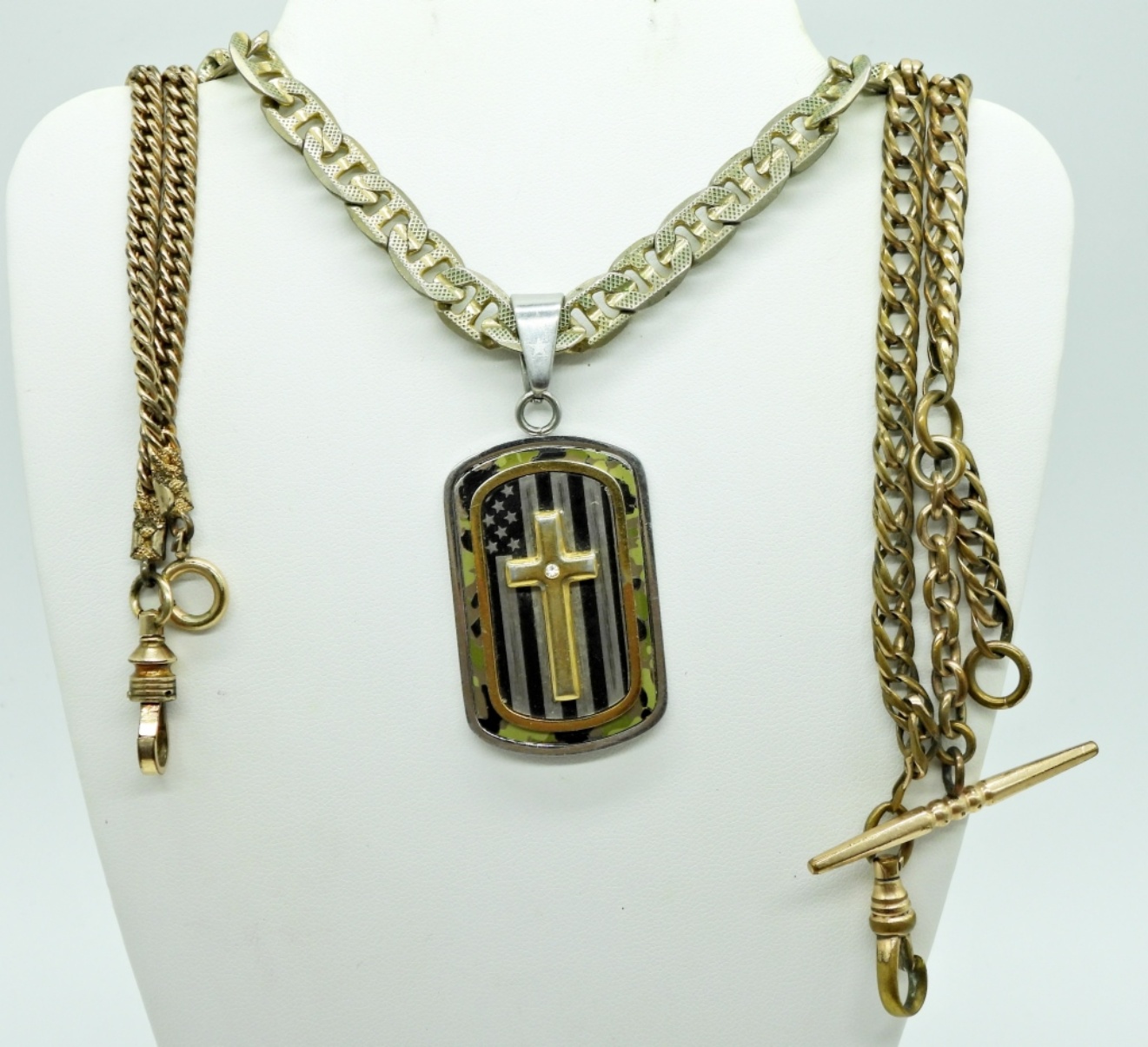 Dog Tag Cross Pendant with Camouflage on a Gold Tone 23″ Chain. Thick Silver Tone Chain, 18-20″ Adjustable. Three Gold Tone Pocket Watch Chains. 12″, 13″ and a 14″ that is Marked “R.F.S. & Co.).