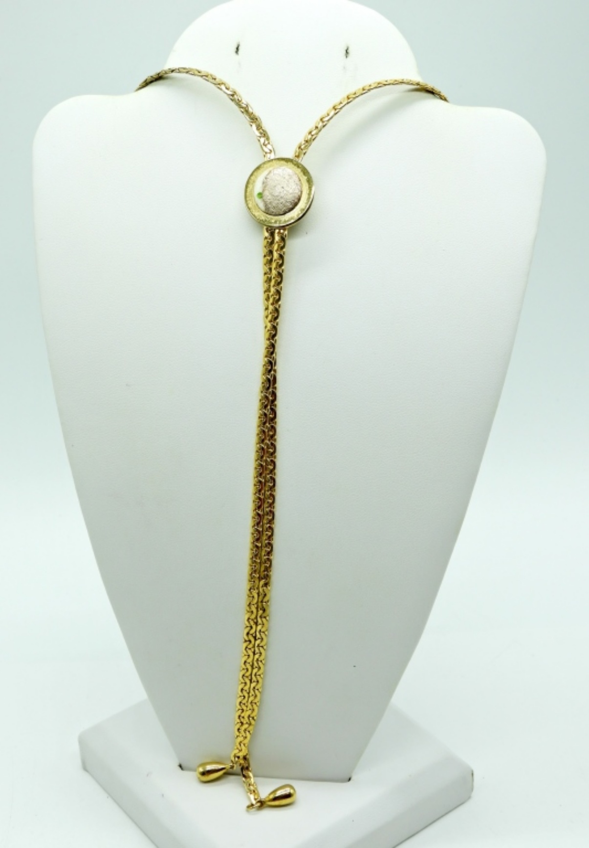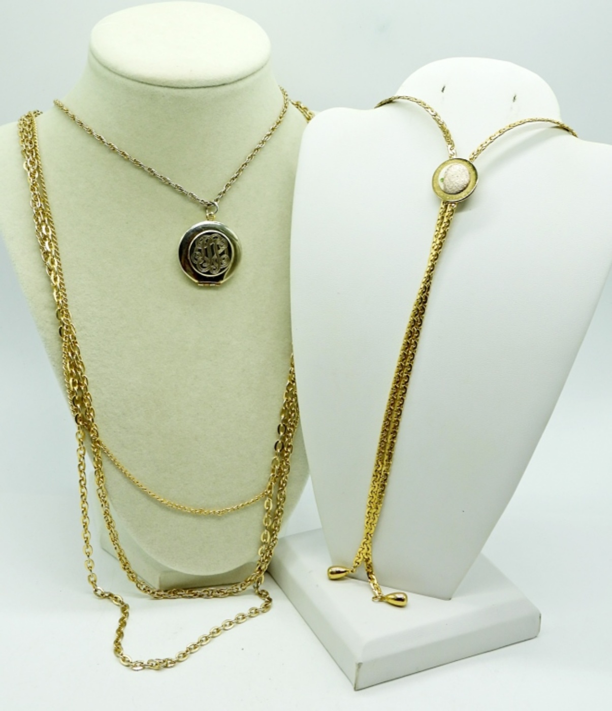 Vintage Gold Tone 3 Strand Necklace with an Engraved Locket, 18″ -34″. Gold Tone 30″ Bolo Tie.