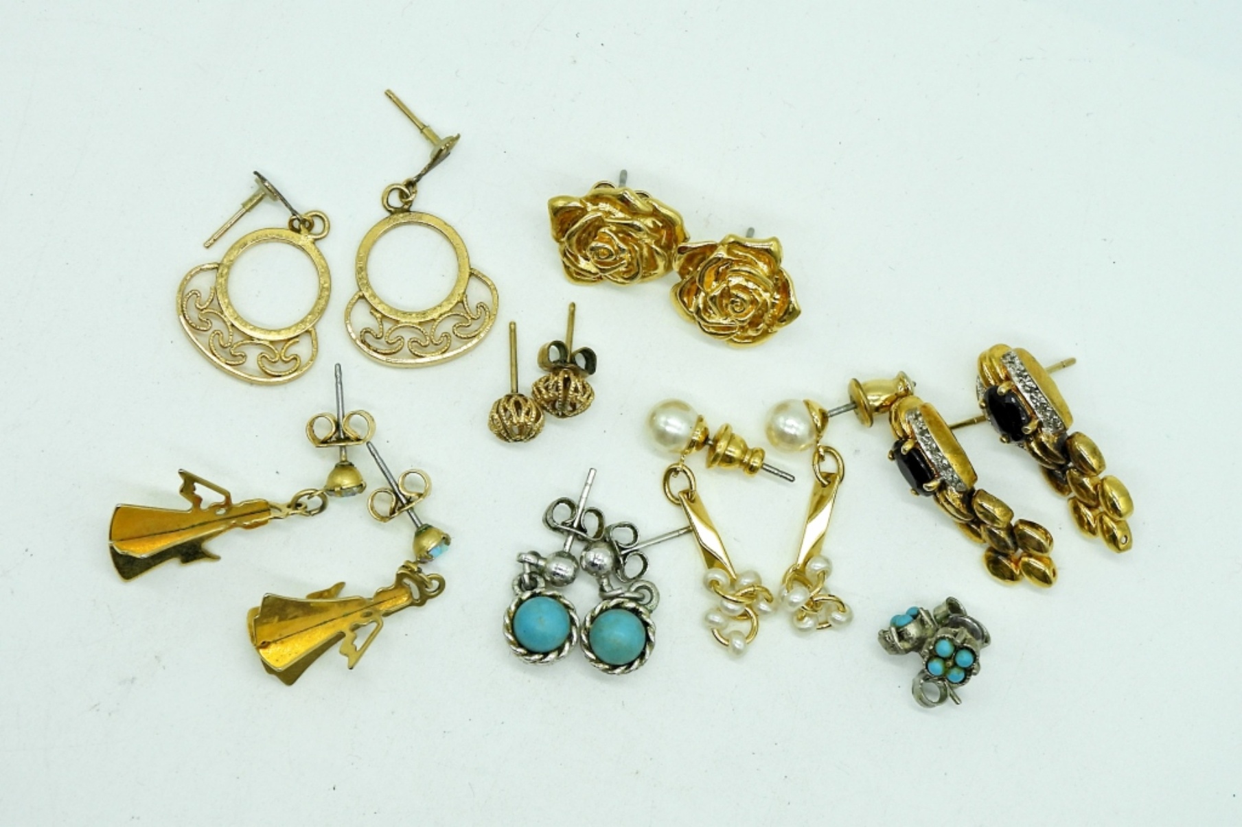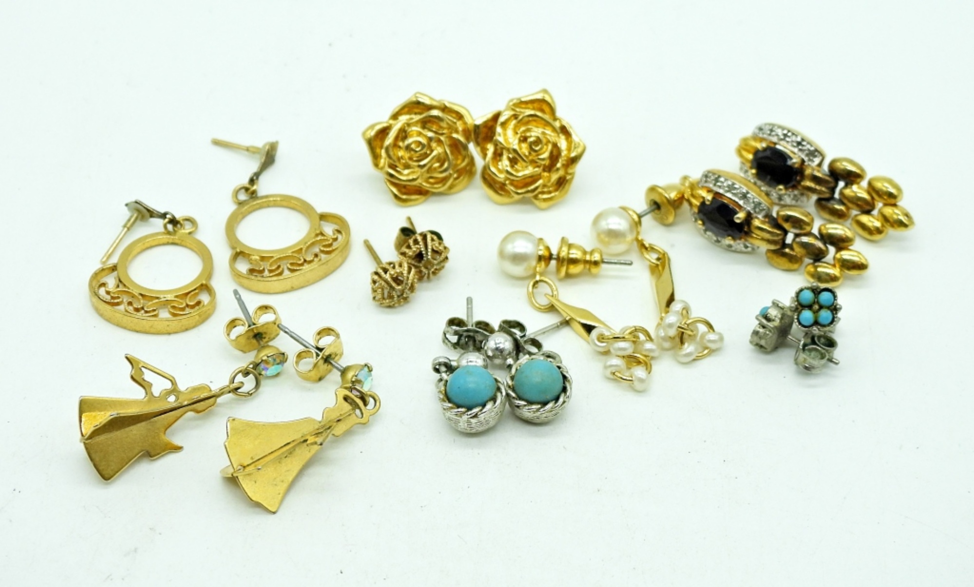 Eight Pair of Gold and Silver Tone Pierced Earrings. The turquoise studs are missing one stone, stone is in a small bag with the earrings.