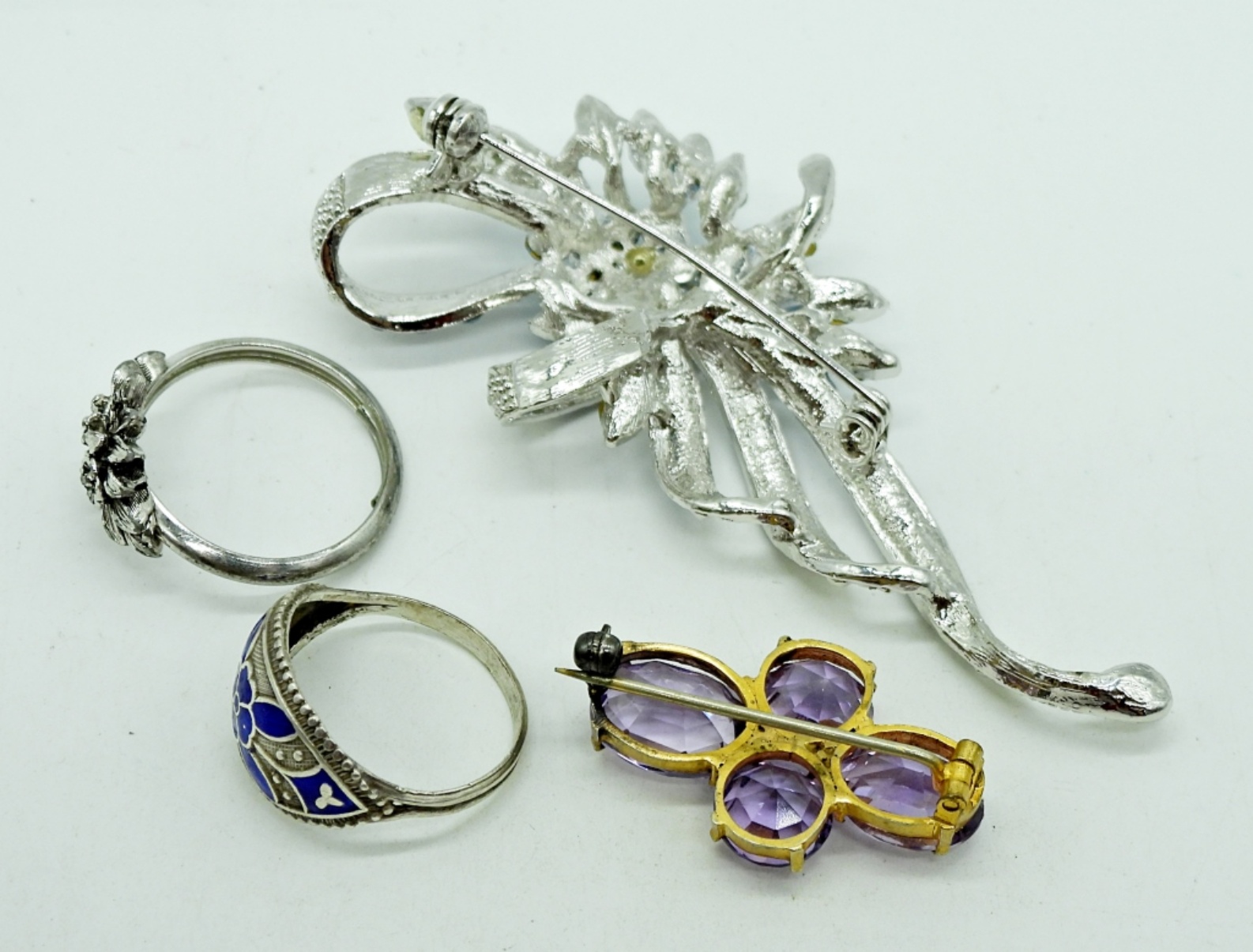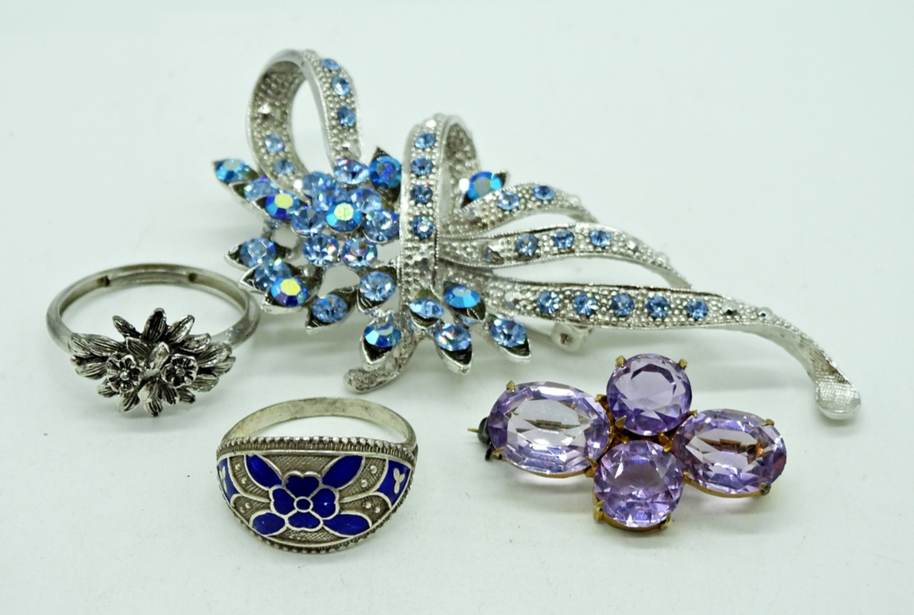 Vintage Rhinestone Brooches & Silver Tone Rings. Rings are Size 7.5 & 8. Vintage Silver tone Brooch with Blue Rhinestones measures 3″x 1″. Gold Tone Brooch with 4 Purple Gemstones measures 1 1/4″x .5″.
