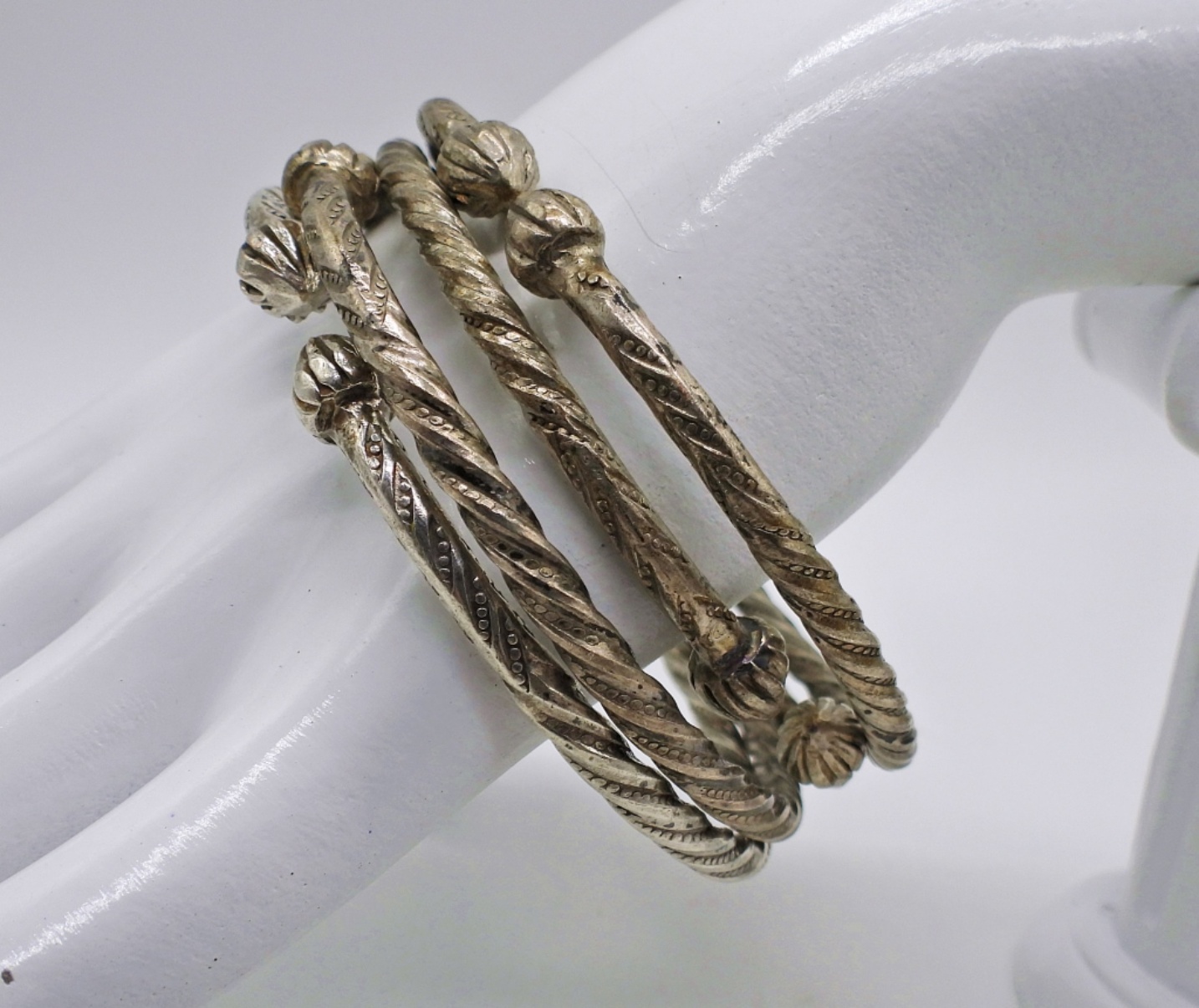 Four Silver tone Jamaican Style Bangle Bracelets, 8.5″.