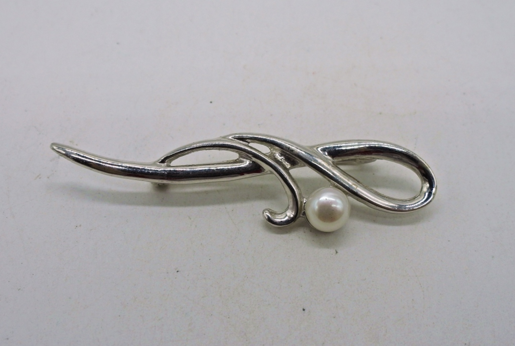 Two Silver Tone Fashion Necklaces with a bracelet and Brooch with Pearl. 20″ Chain, Matching 7″ bracelet. 54″ Fashion Necklace. Brooch is 2 1/4″.