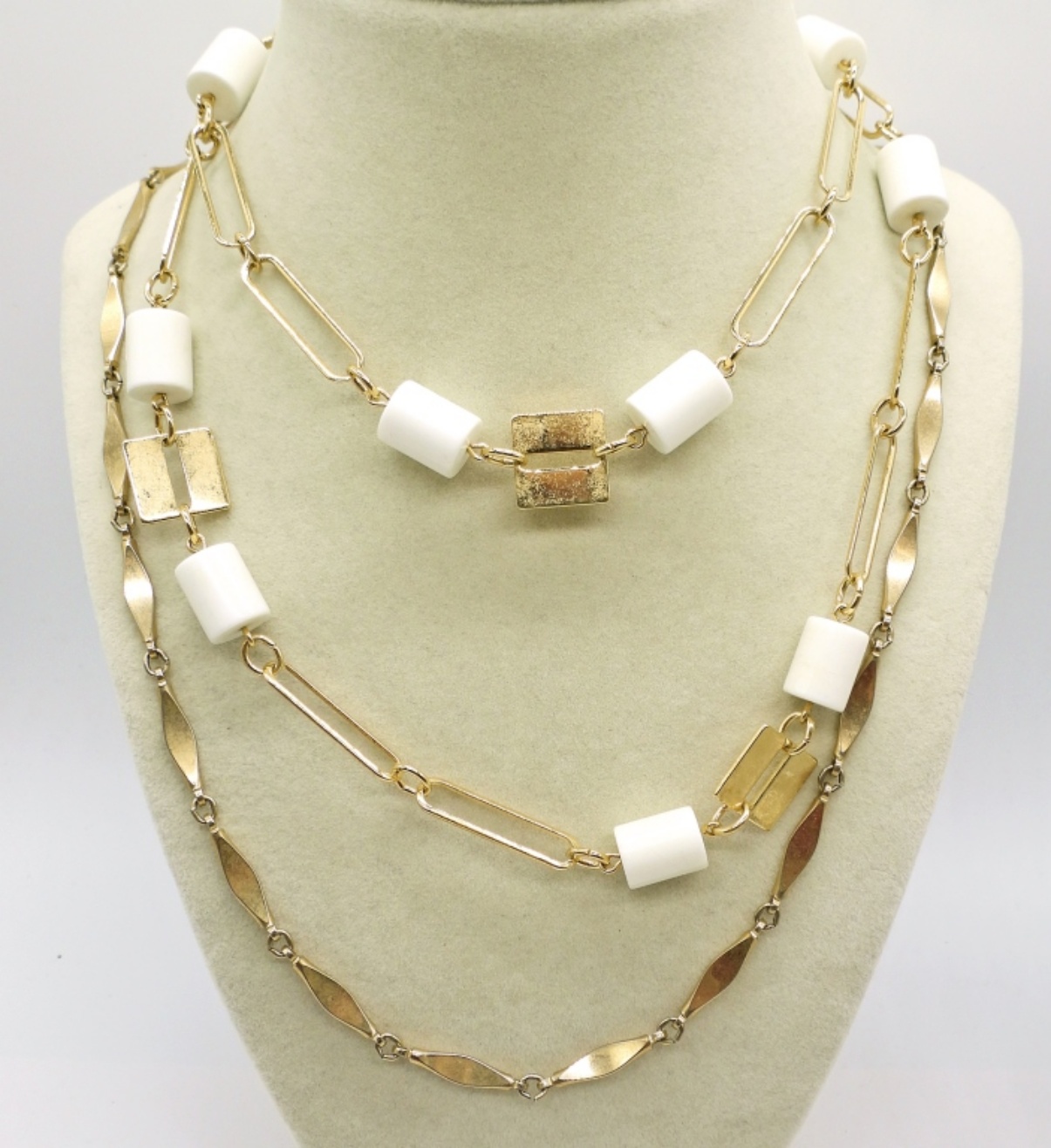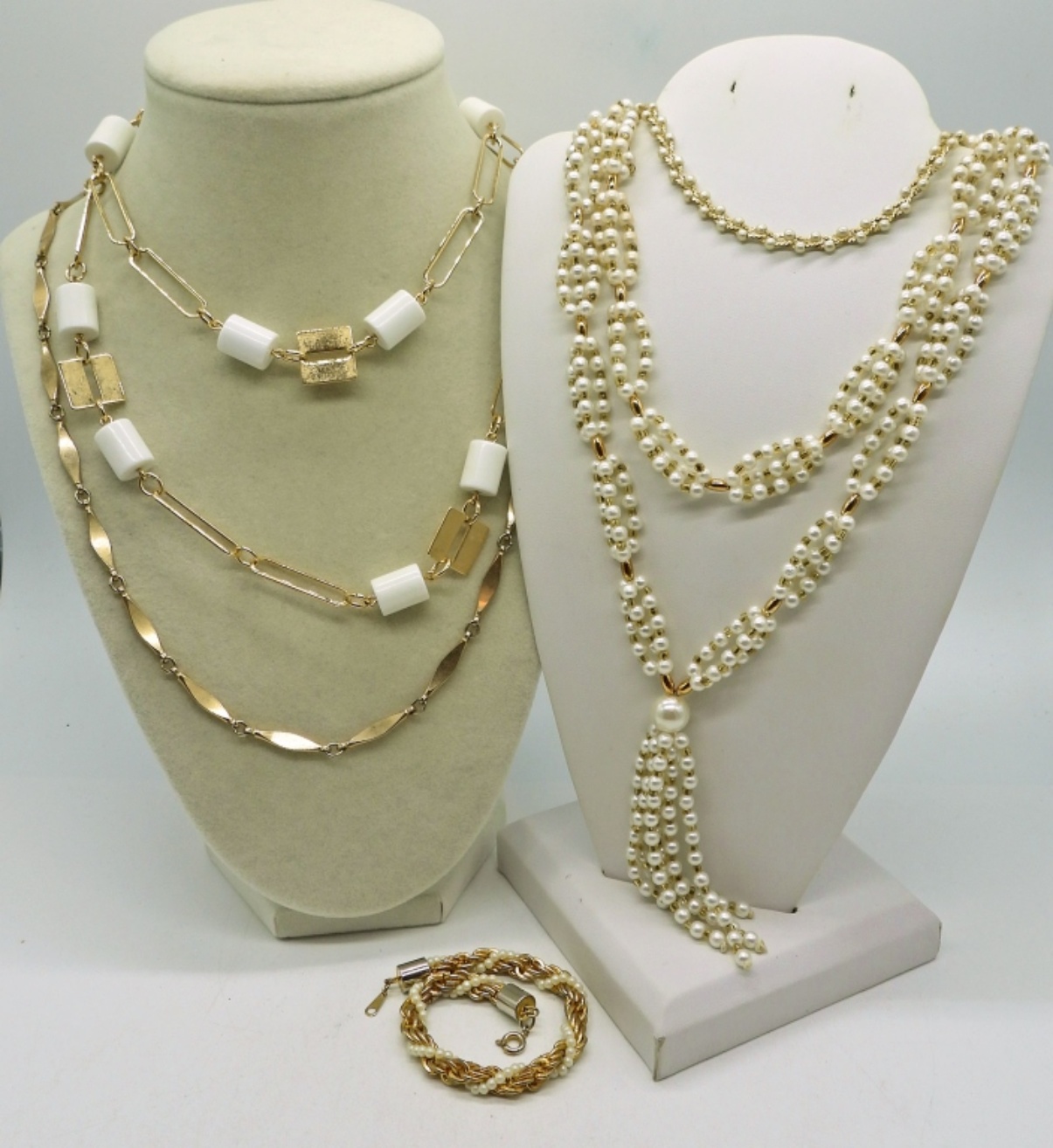 30″ Gold tone Faux Pearl Beaded necklace. 30″ Gold tone, White Bead Fashion Necklace. 28″ Gold tone Fashion Necklace. 32″ Braided Chain Necklace with Faux Pearl Beads. 7″ Gold tone chain / Pearl Braded Bracelet.