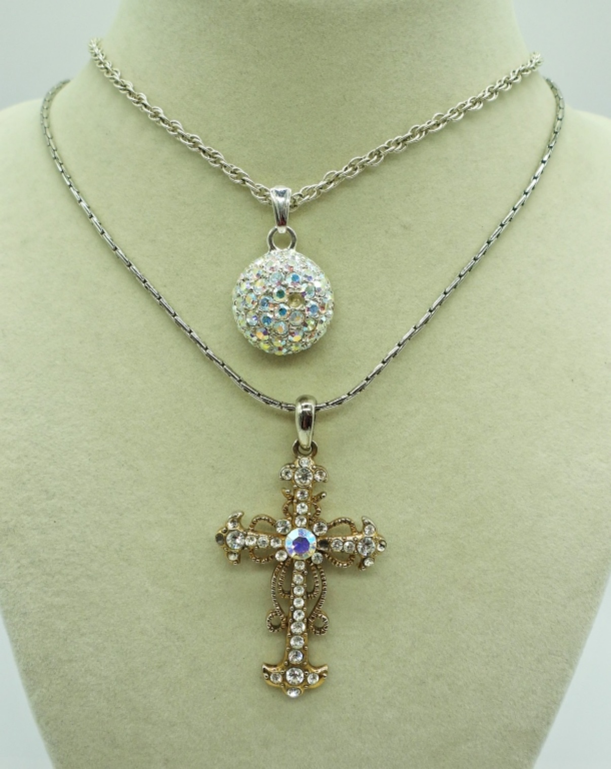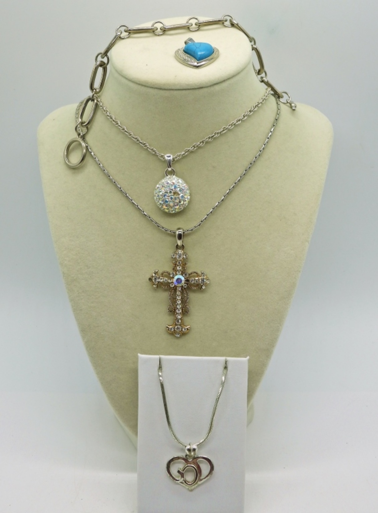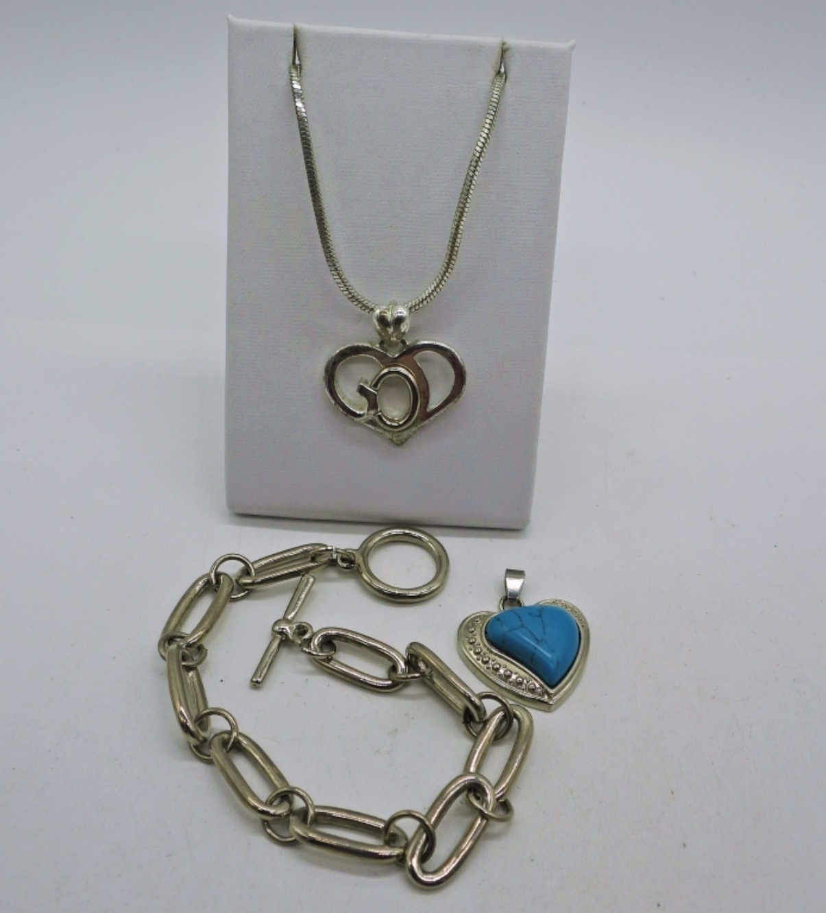 Three Gold and Silver tone Fashion Necklaces, Chains are 19″, 20″ & 22″. Faux Turquoise Heart Pendant in silver tone. Chain Bracelet, 8″.