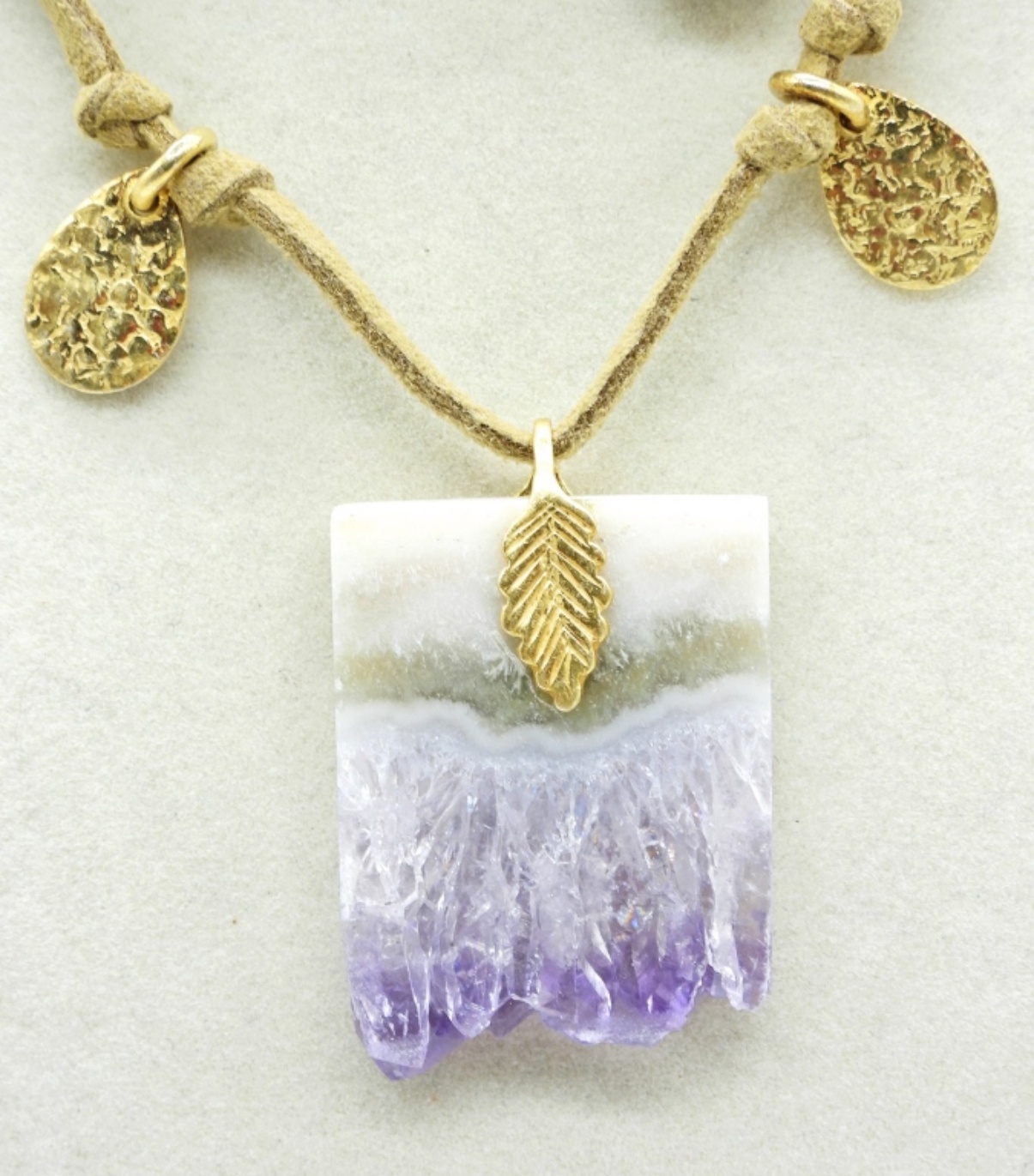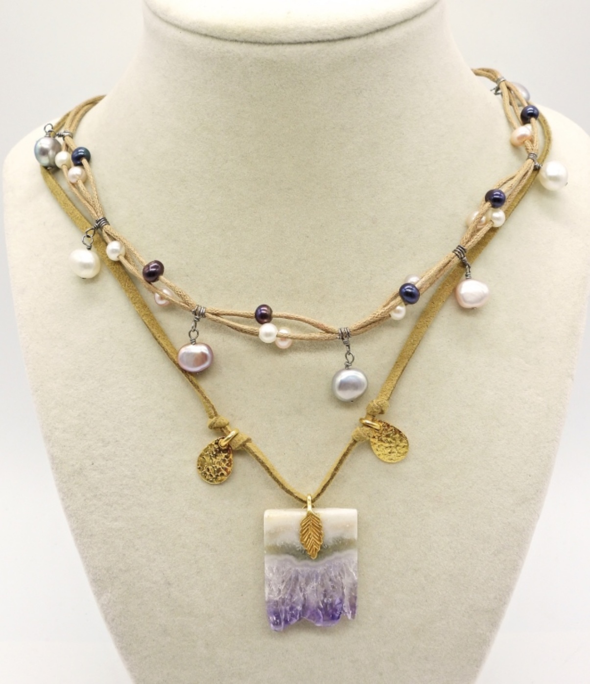 Amethyst Geode Chunk pendant on a leather cord with gold tone accent pieces, 25″. Freshwater Pearls on a corded necklace, 18″ adjustable.