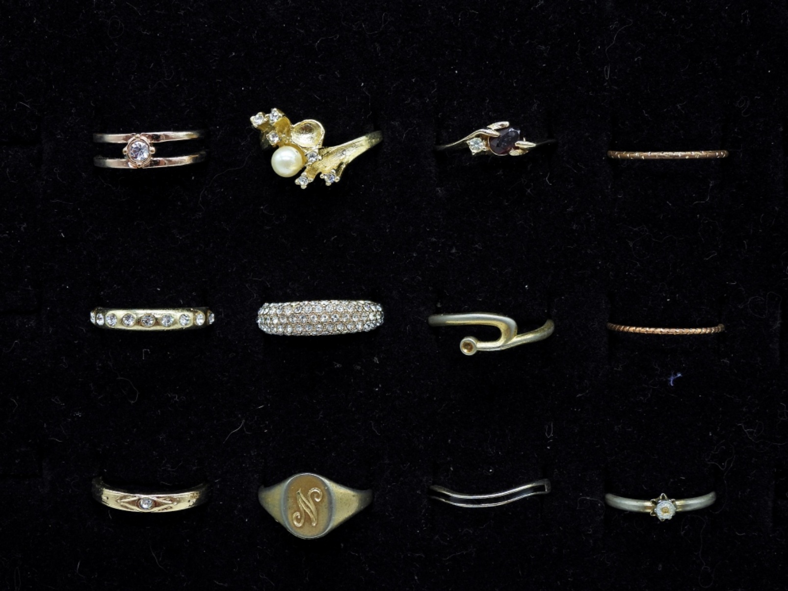 Twelve Gold Tone Fashion Rings in Sizes 7 and 8.
