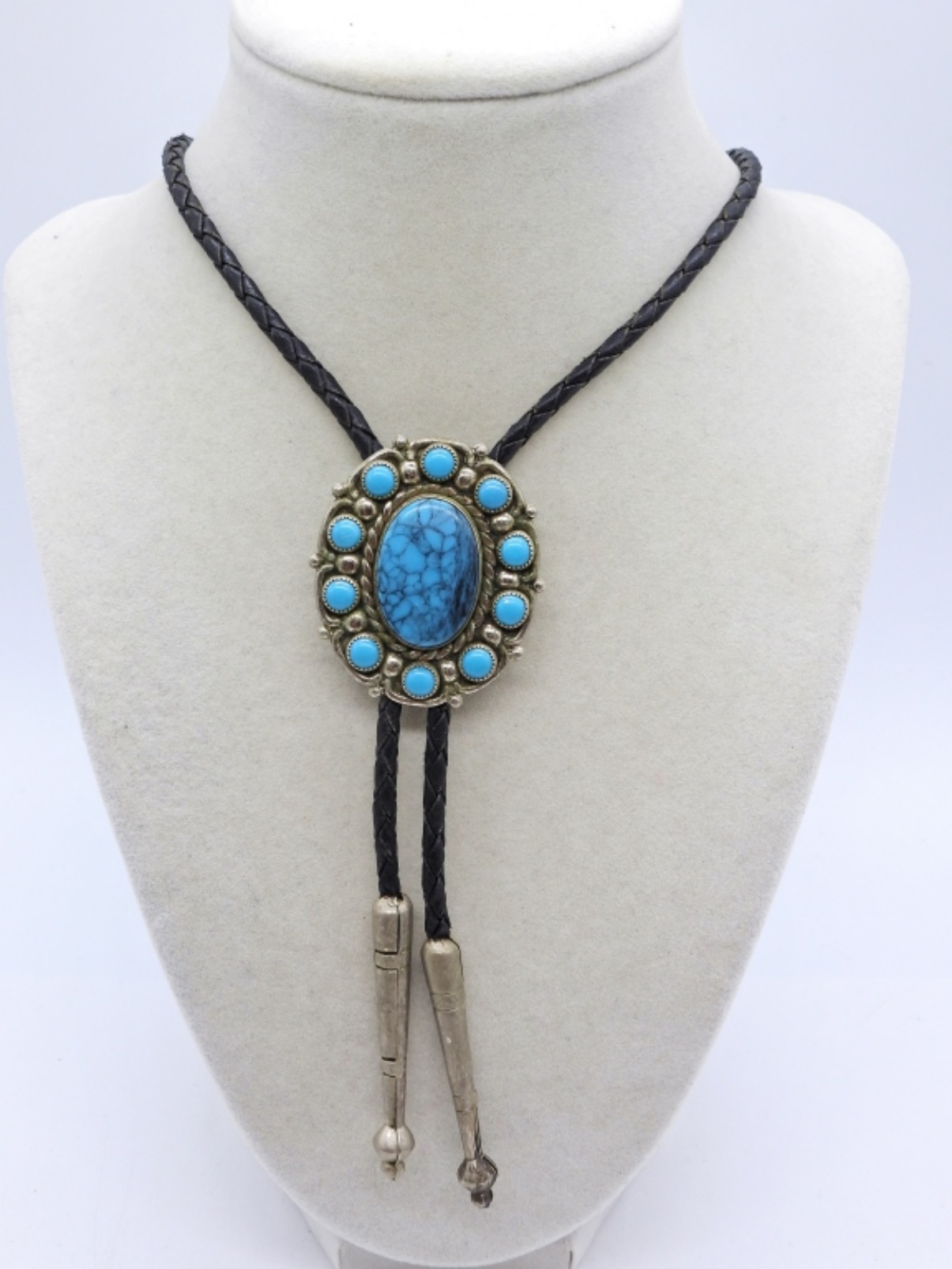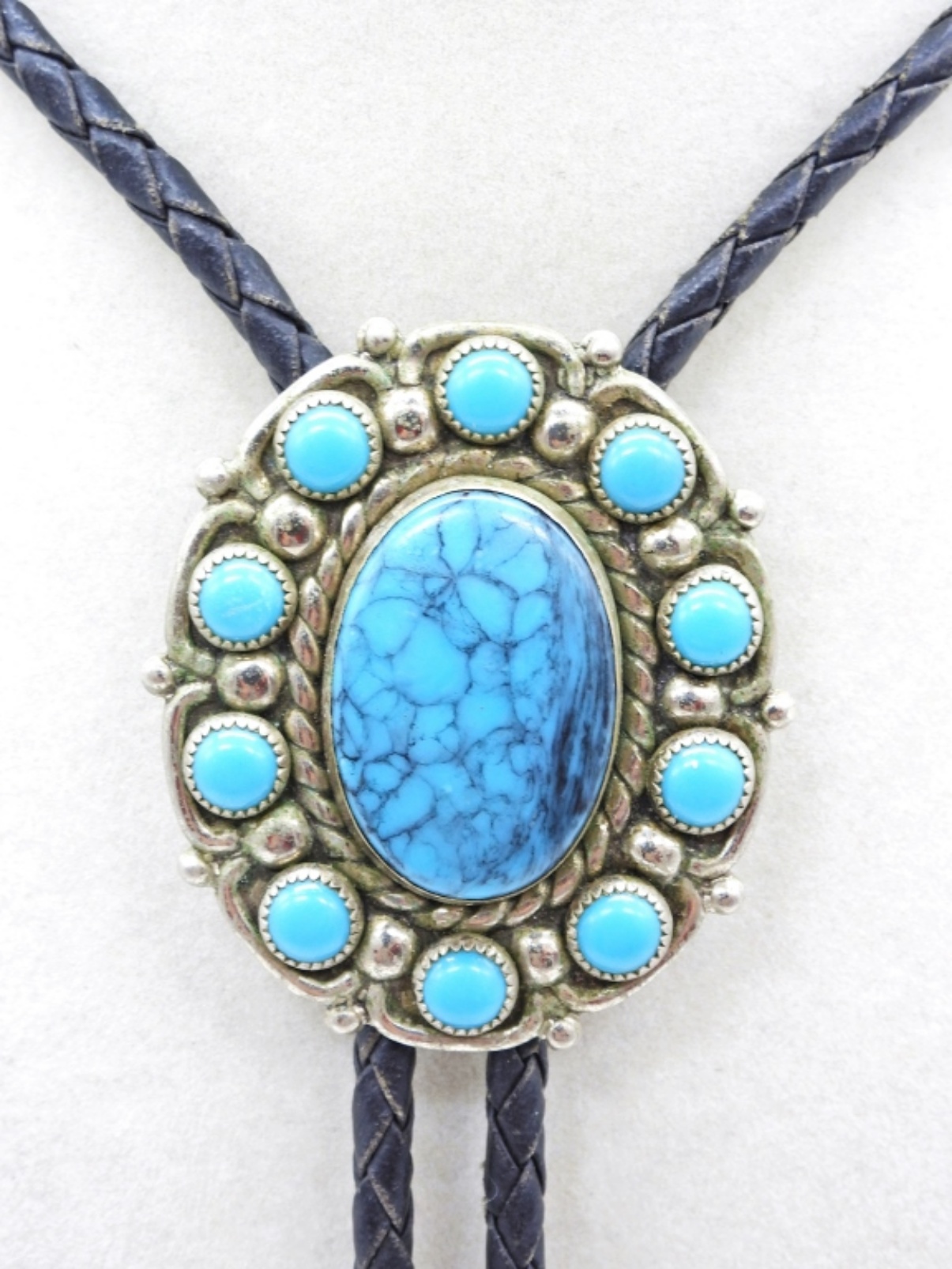 Faux Turquoise Bolo Tie, 32″, on a leather cord. Made with Nickel Silver. Stamped “Bell”.