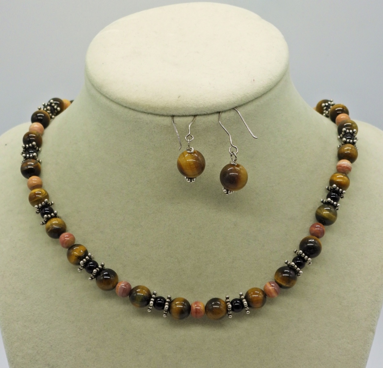 Beaded Tigers Eye Necklace with Silver Accent Beads and Sterling Clasp, 18″. Tigers Eye Drop Earrings.