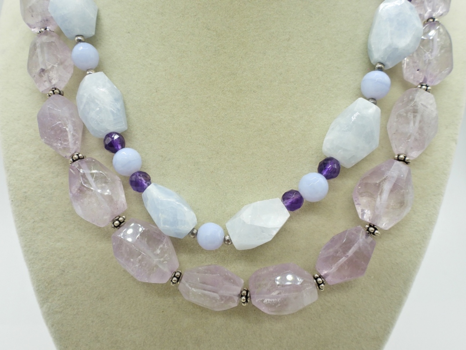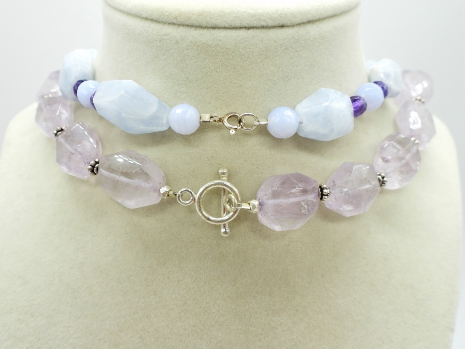 17″ Blue Lace Agate & Amethyst Beaded Necklace. Big & Beautiful Chunks of Agate!! 18″ Rose Quartz Necklace, Large Chunky Gemstones!
