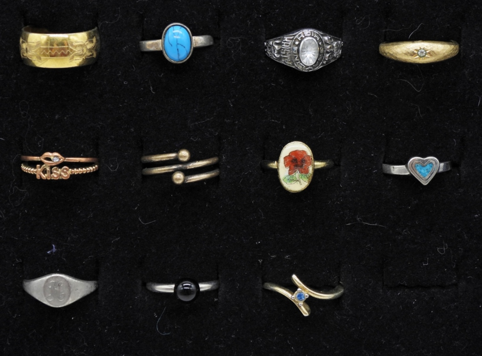 Eleven gold and silver tone fashion rings, sizes 4, 5, 6.