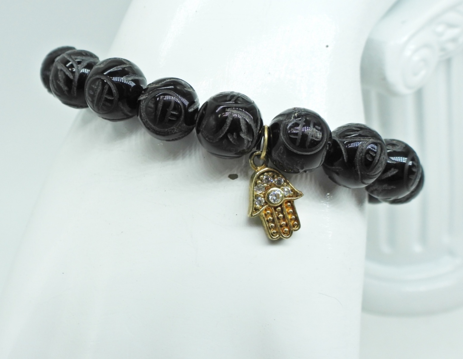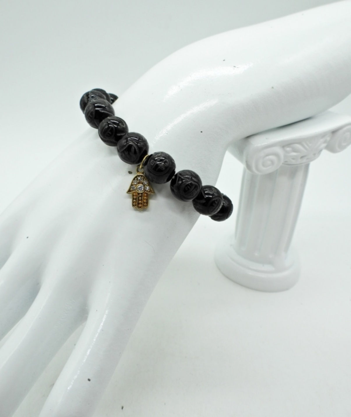 Stretchy 7″ Carved Black Onyx Beaded Bracelet with Gold Tone Hamsa Charm.