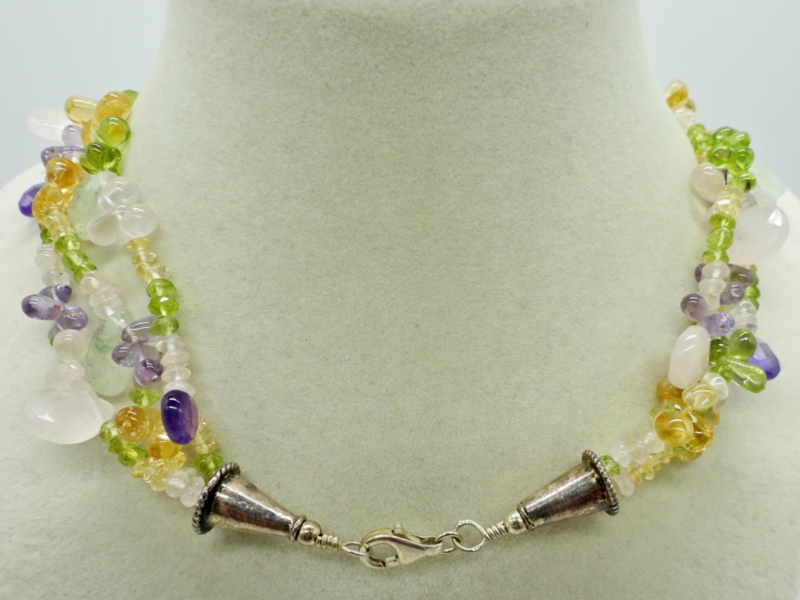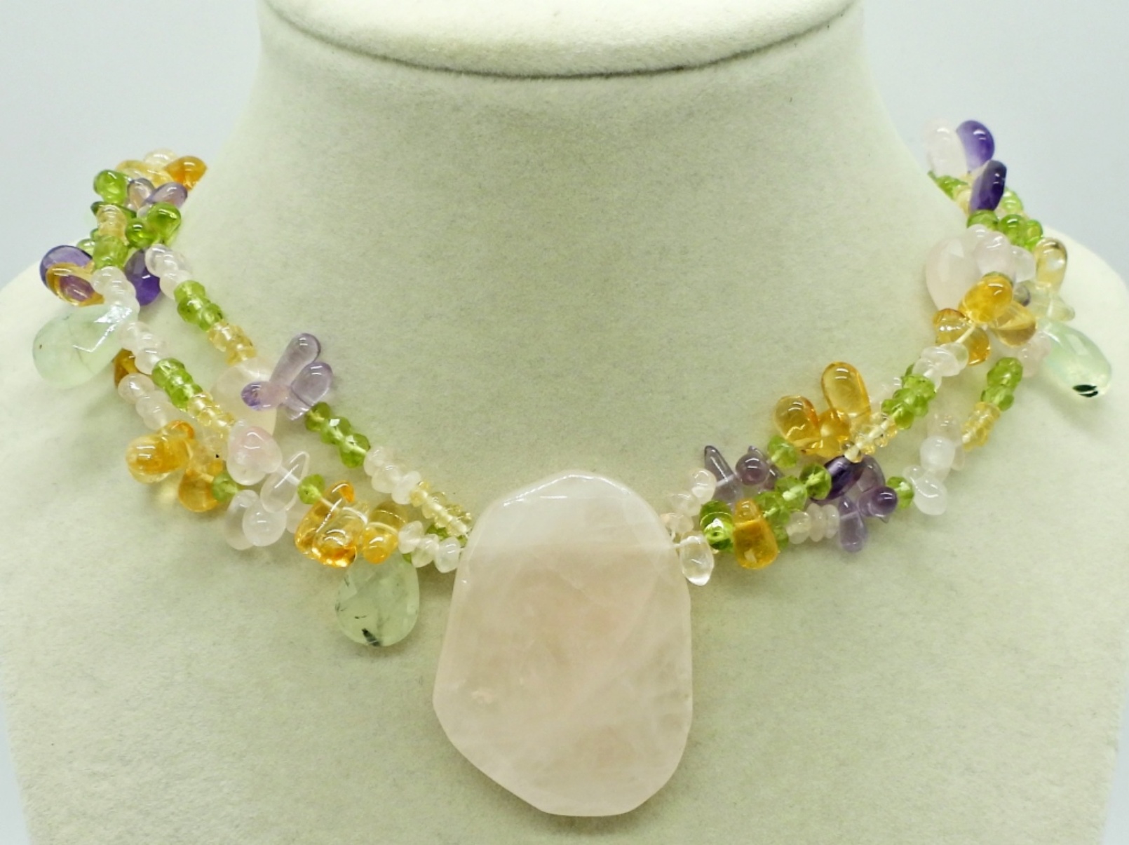 Large Rose Quartz Pendant on a 3 Strand Necklace Beaded with Rose Quartz, Amethyst, Citrine & Peridot. Sterling Clasp. 18″