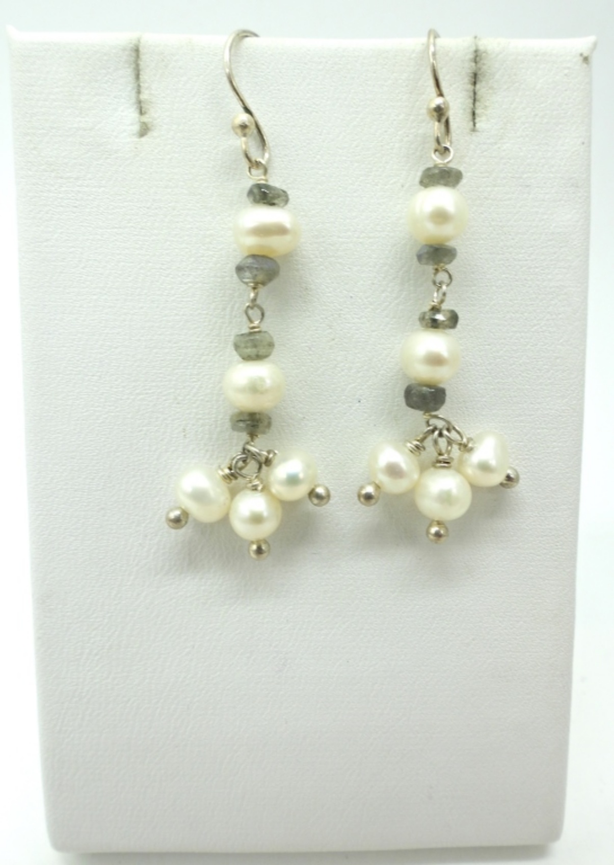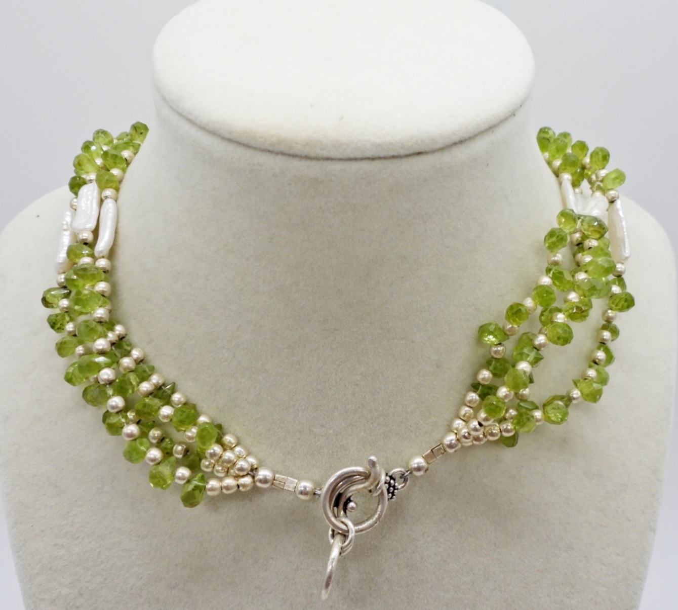 Faceted Teardrop Peridot Beads with Pearl Beads on a 16″-18″ adjustable Necklace with matching earrings.