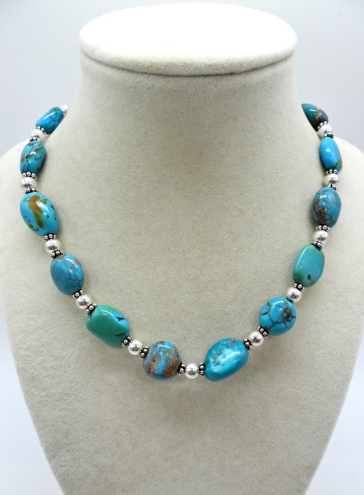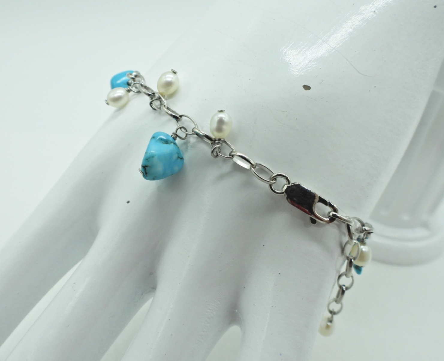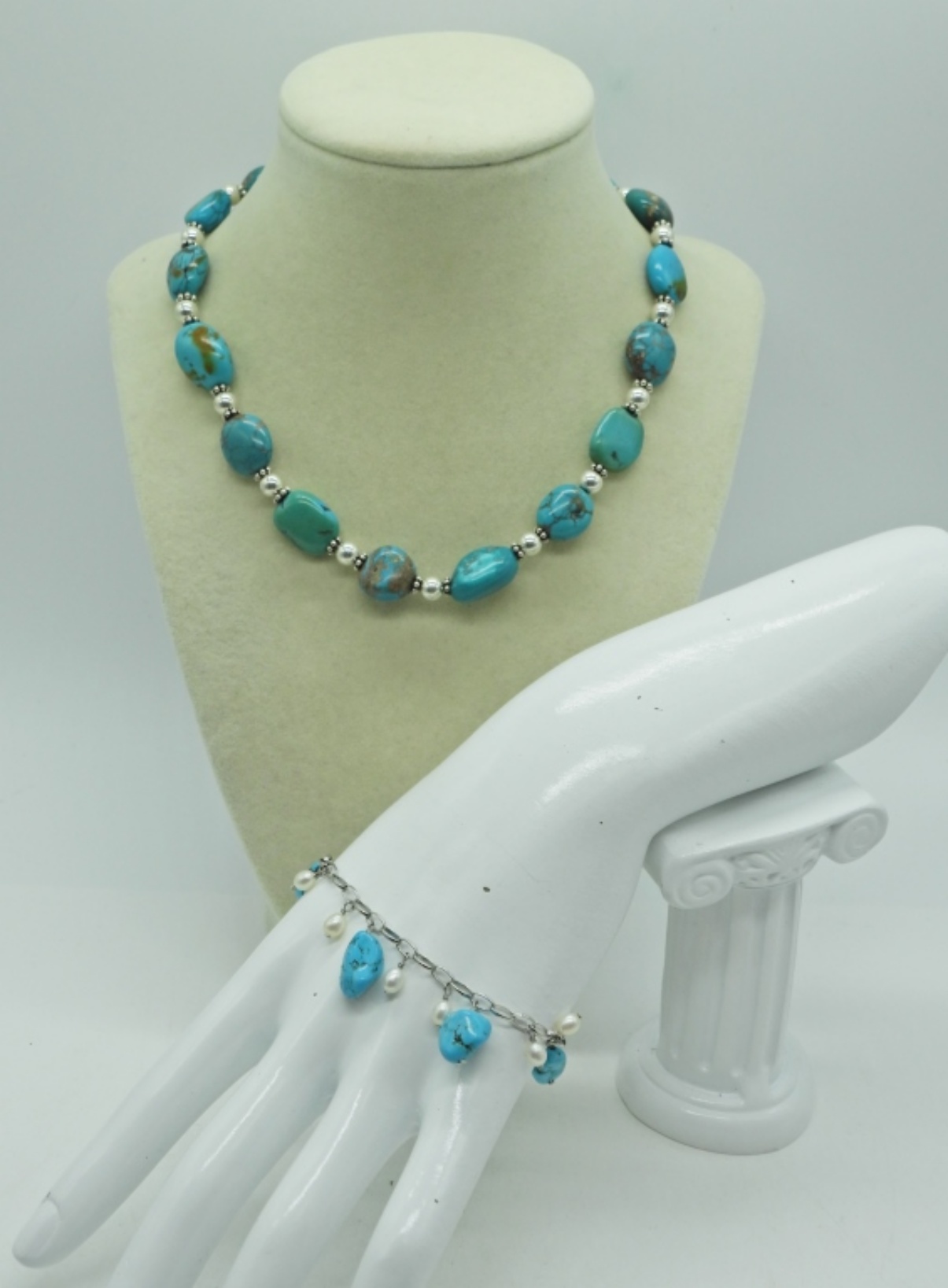 16″ Blue Turquoise necklace with silver tone beads, toggle clasp. 8″ turquoise and pearl bracelet, silver tone.