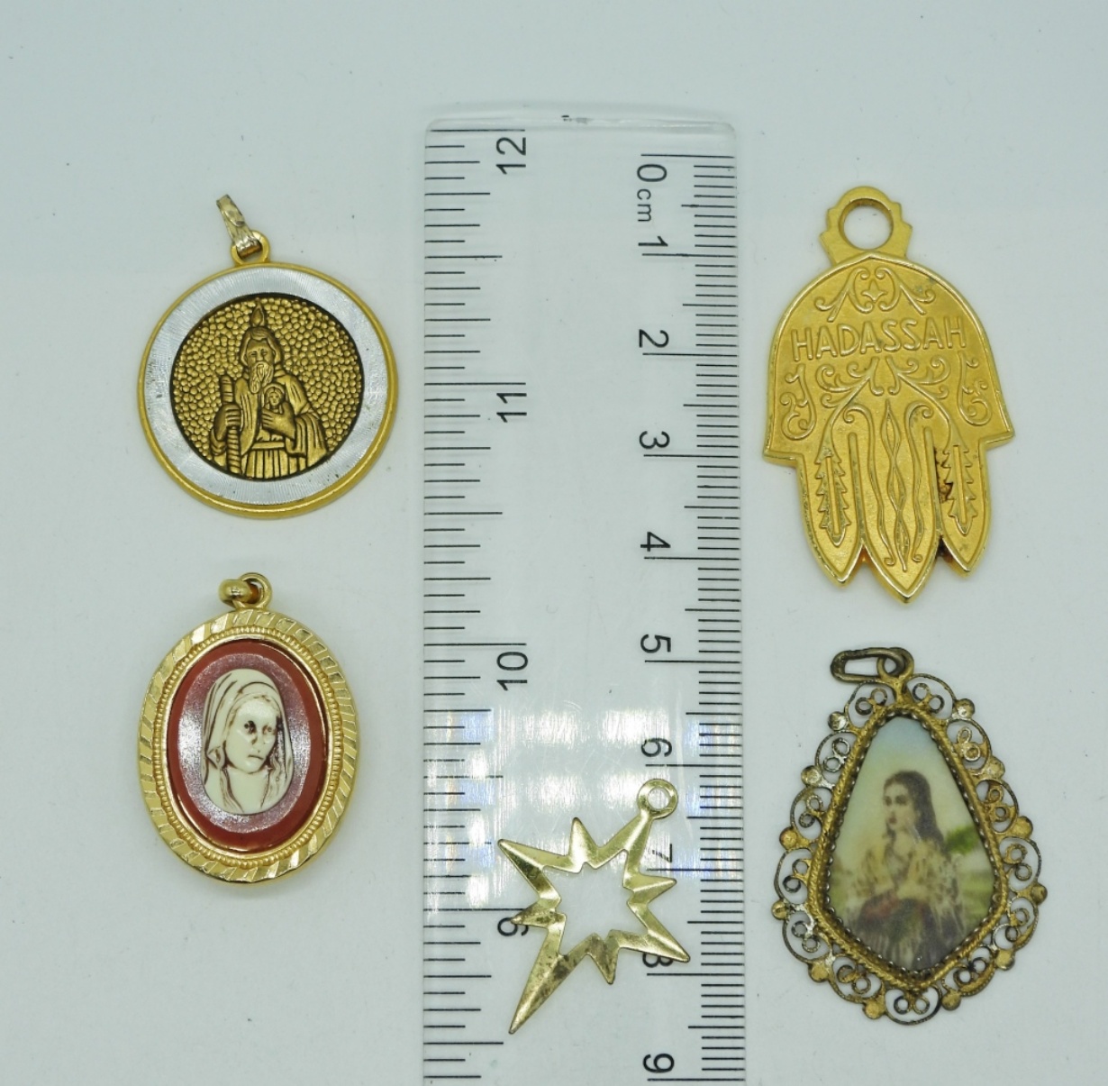 Five Gold Tone Religious Pendants. See Photos for Measurements.