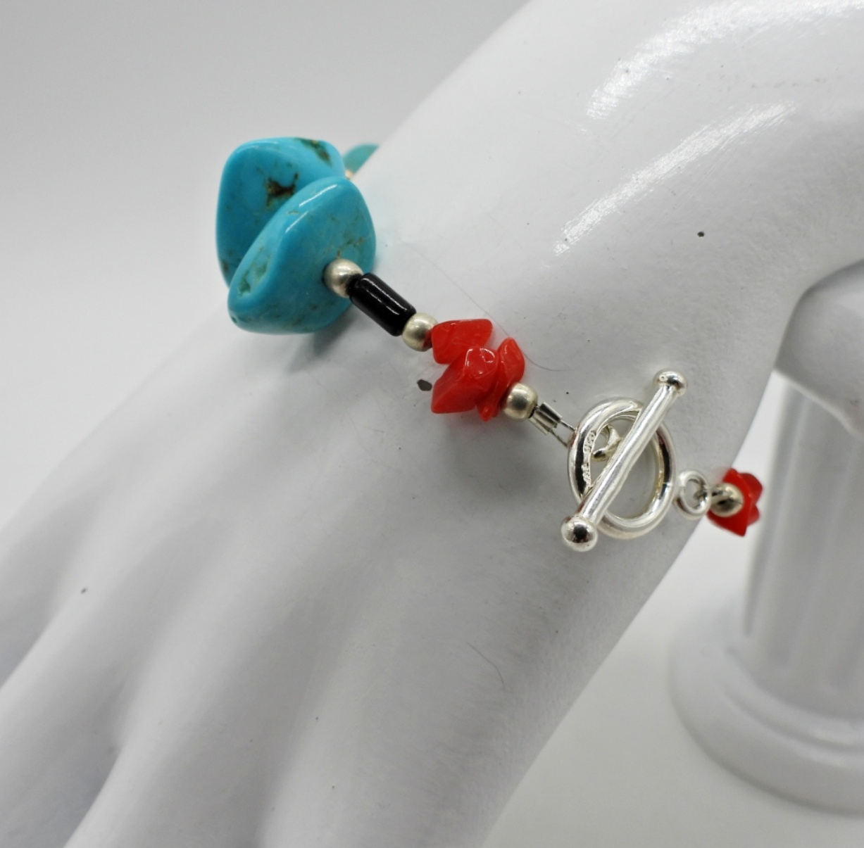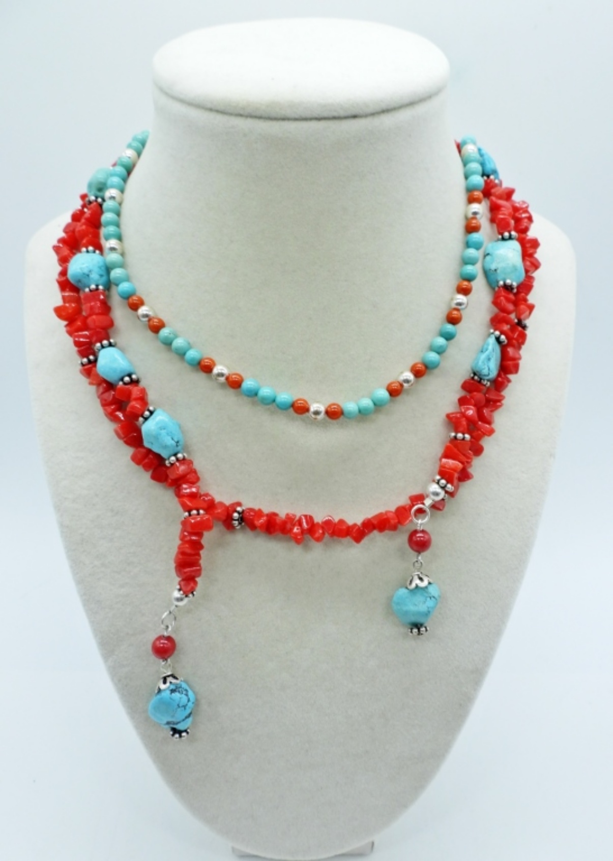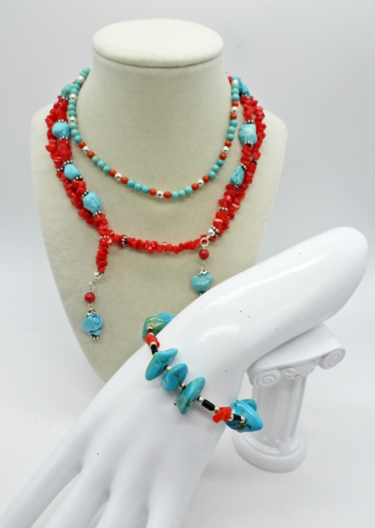 38″ Lariat Necklace with Red Coral Beads with Turquoise and Silver Tone Beads. 16″ Turquoise, Silver Tone and Red Coral Beaded necklace. 7″ Bracelet with Turquoise, Red Coral and Black Beads.